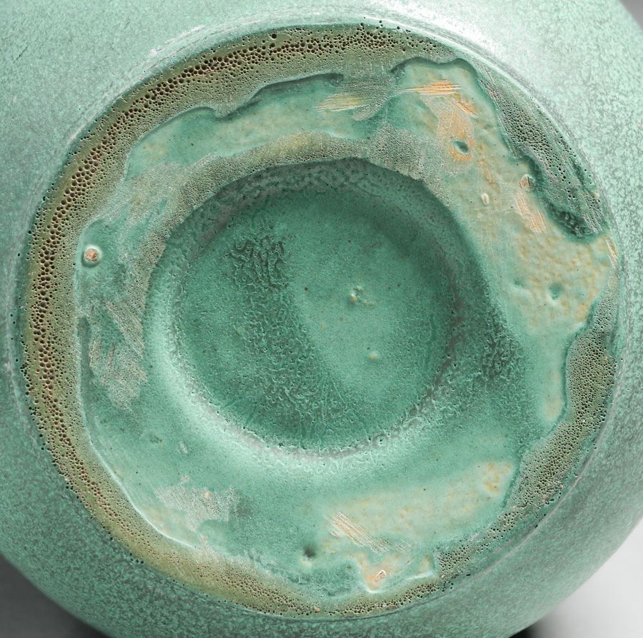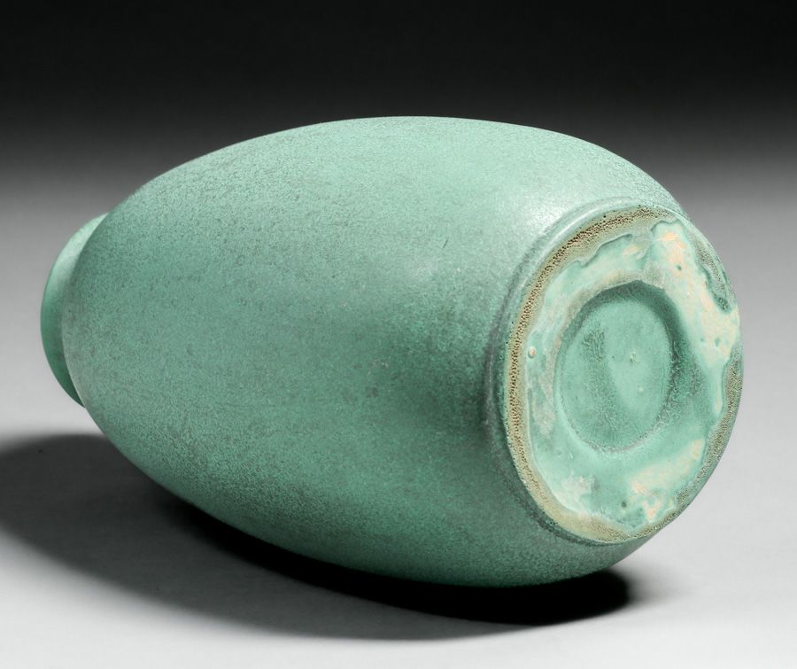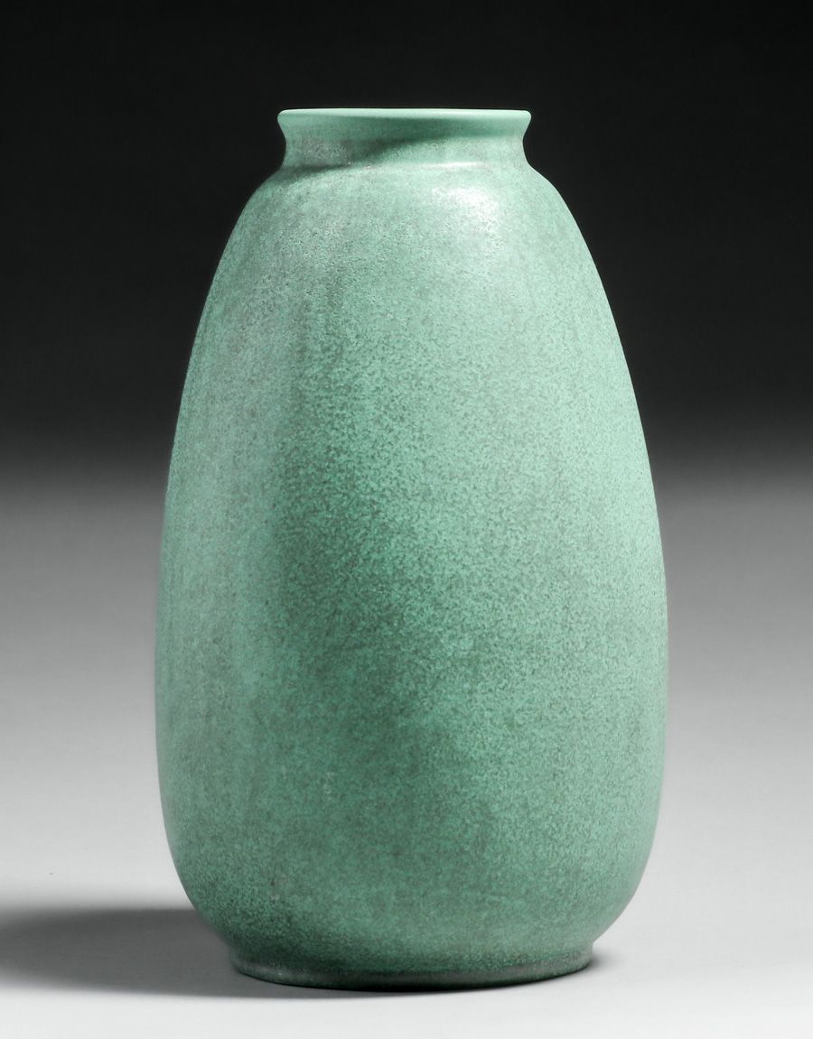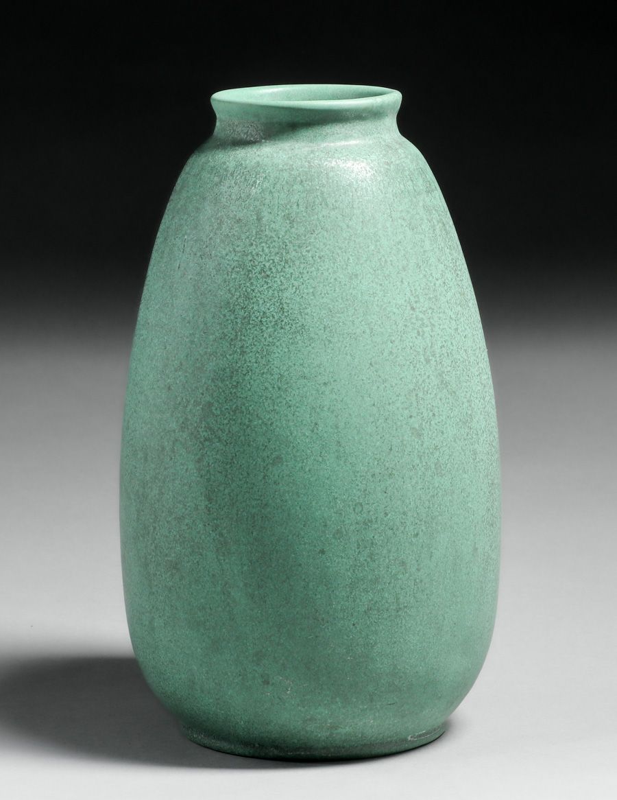 - Large Teco Pottery Matte Green Bulbous Vase c1910