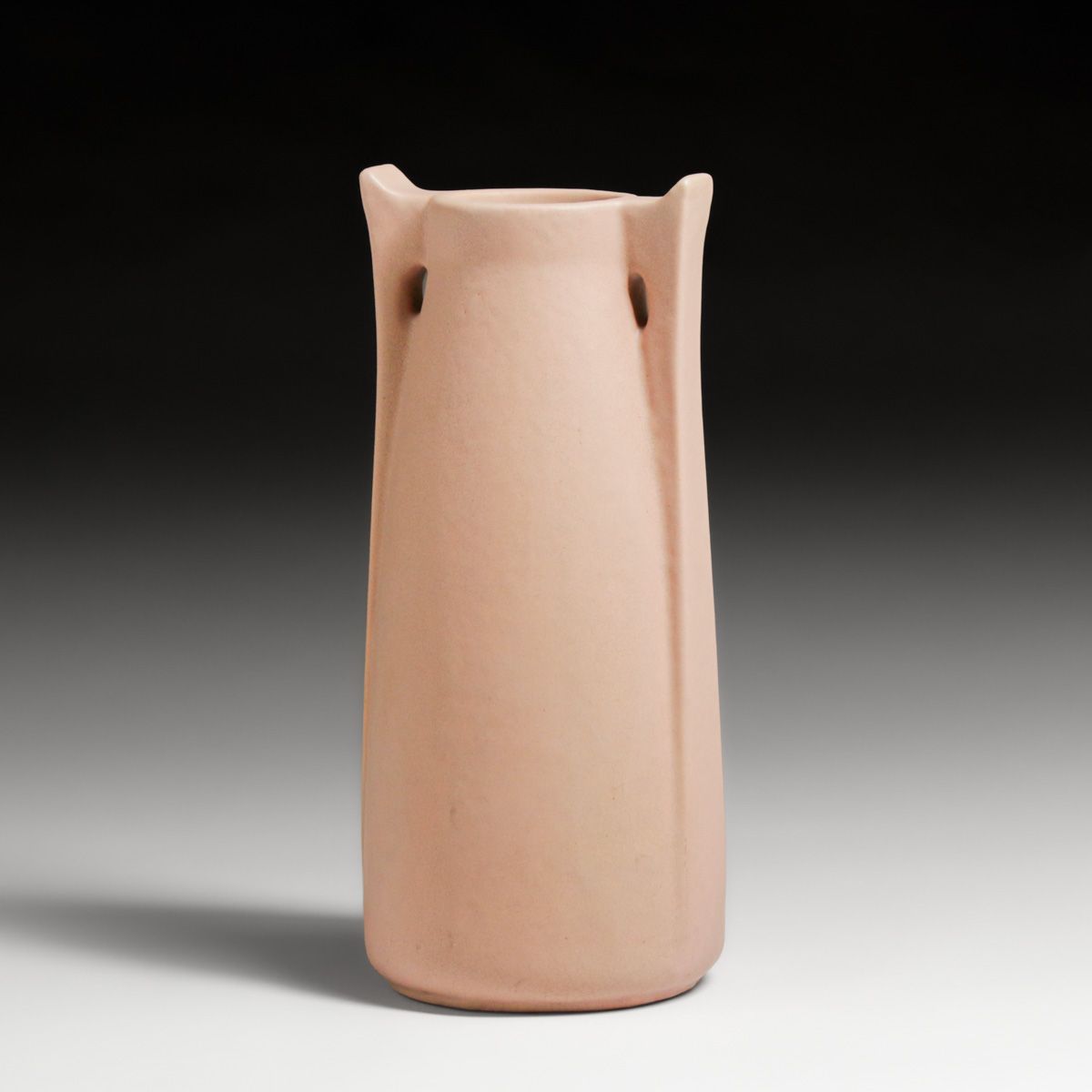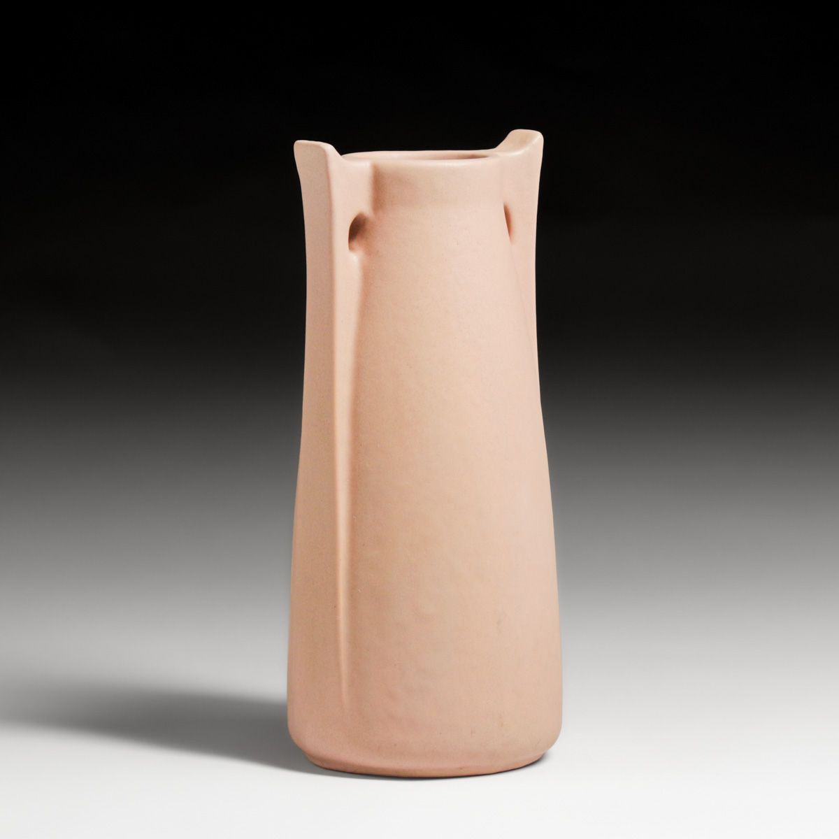 - Rare Teco Pottery #266 Matte Pink Prairie School Two-Handled Vase c1910