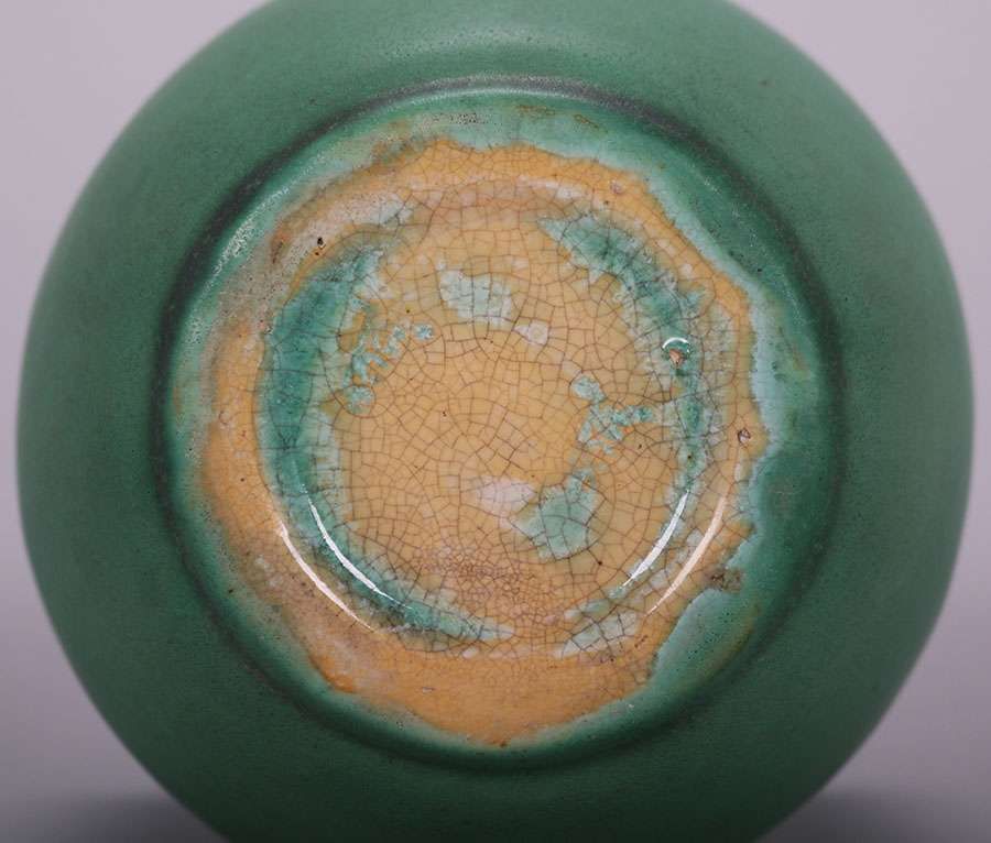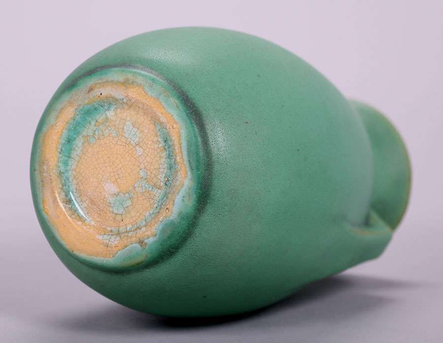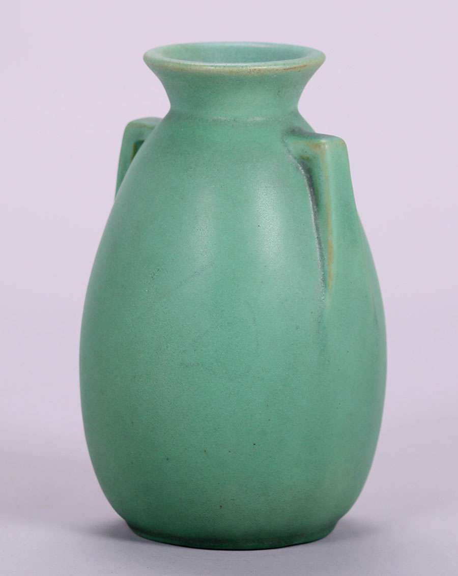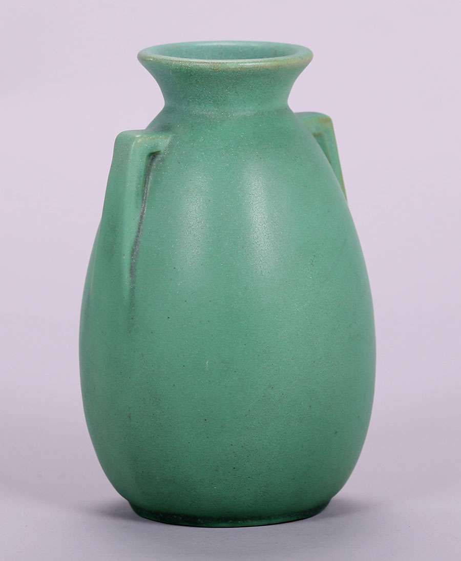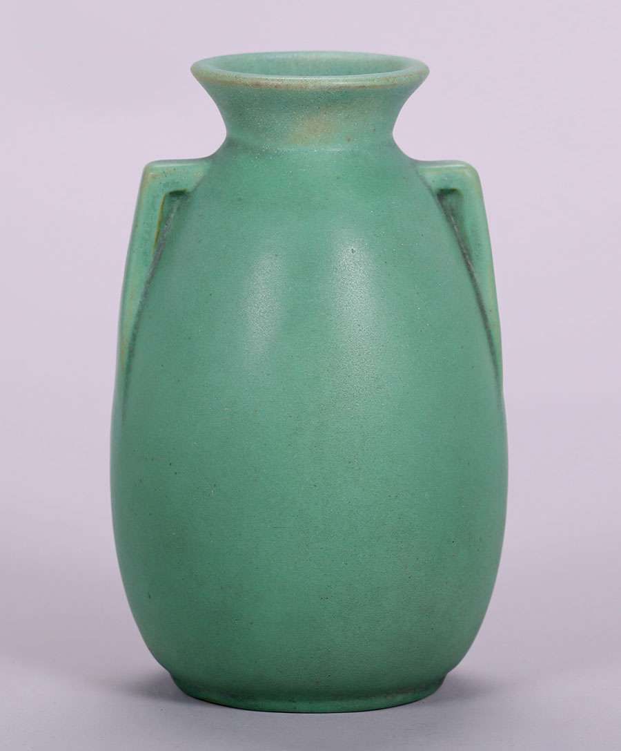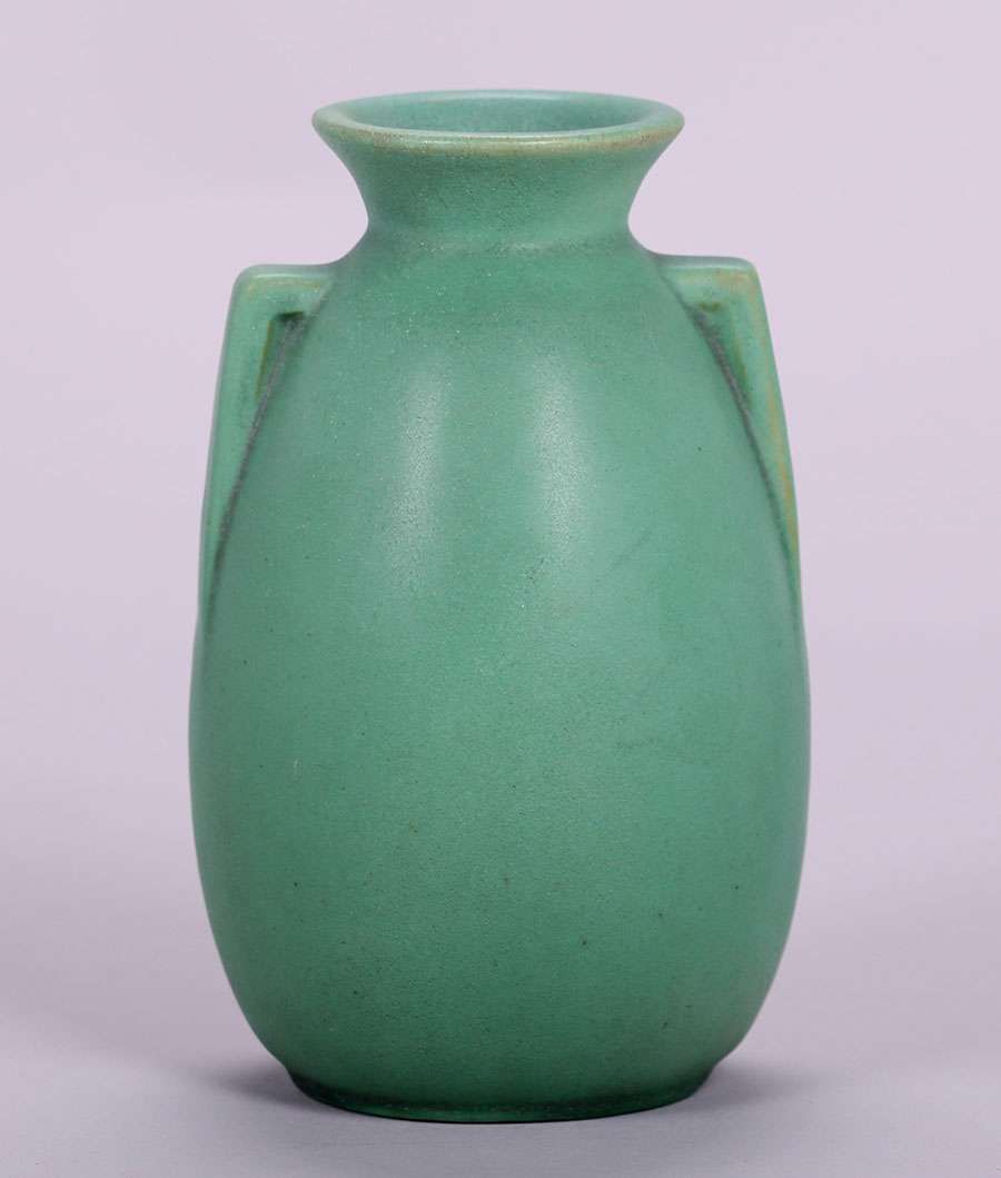 Teco matte green two-handled vase. Signed. Invisible professional repair to small rim chip. 7"h x 4"d SOLD