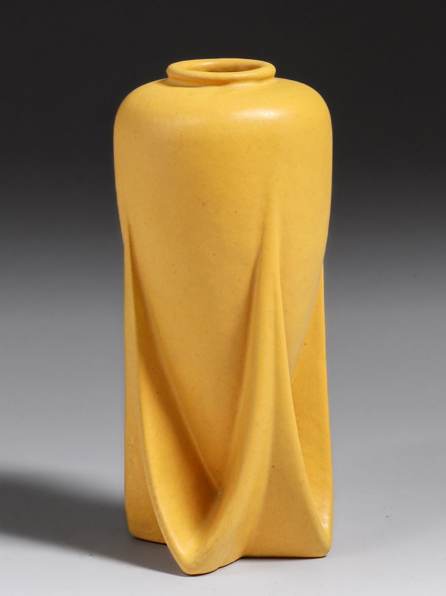 Teco Pottery #127 Matte Yellow Rocket Vase c1910. This highly desirable Teco form almost never surfaces in any color but green. Signed. Invisible professional restoration to small edge chip, otherwise perfect condition. 8 5/8″h x 4″d SOLD