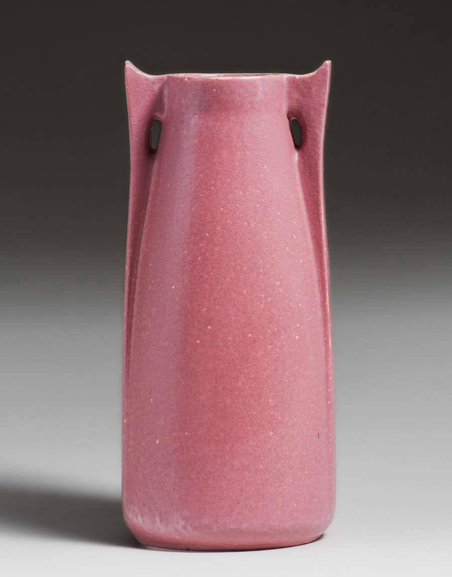 Teco Pottery #266 Two-Handle Vase c1910. Signed twice. Interesting organic texture to unusual matte rose glaze. Invisible professional restoration to small edge chip, otherwise perfect condition. 11.75"h x 4.5"d SOLD
