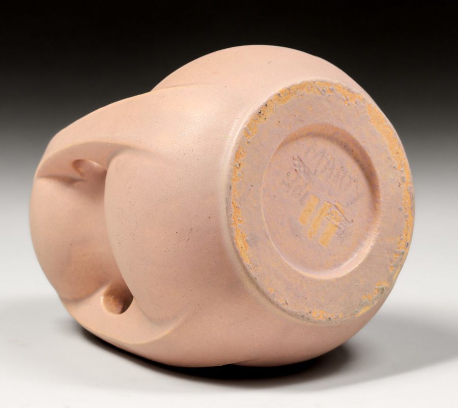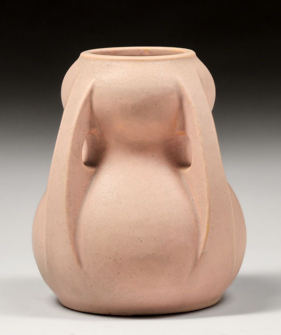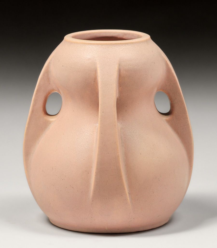 Teco Pottery #287 Matte Pink Bulbous Four-Handled Vase c1910. Signed. Perfect condition. 6.5″h x 5.25″d SOLD