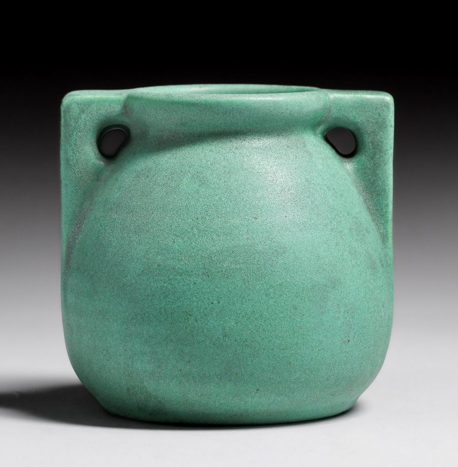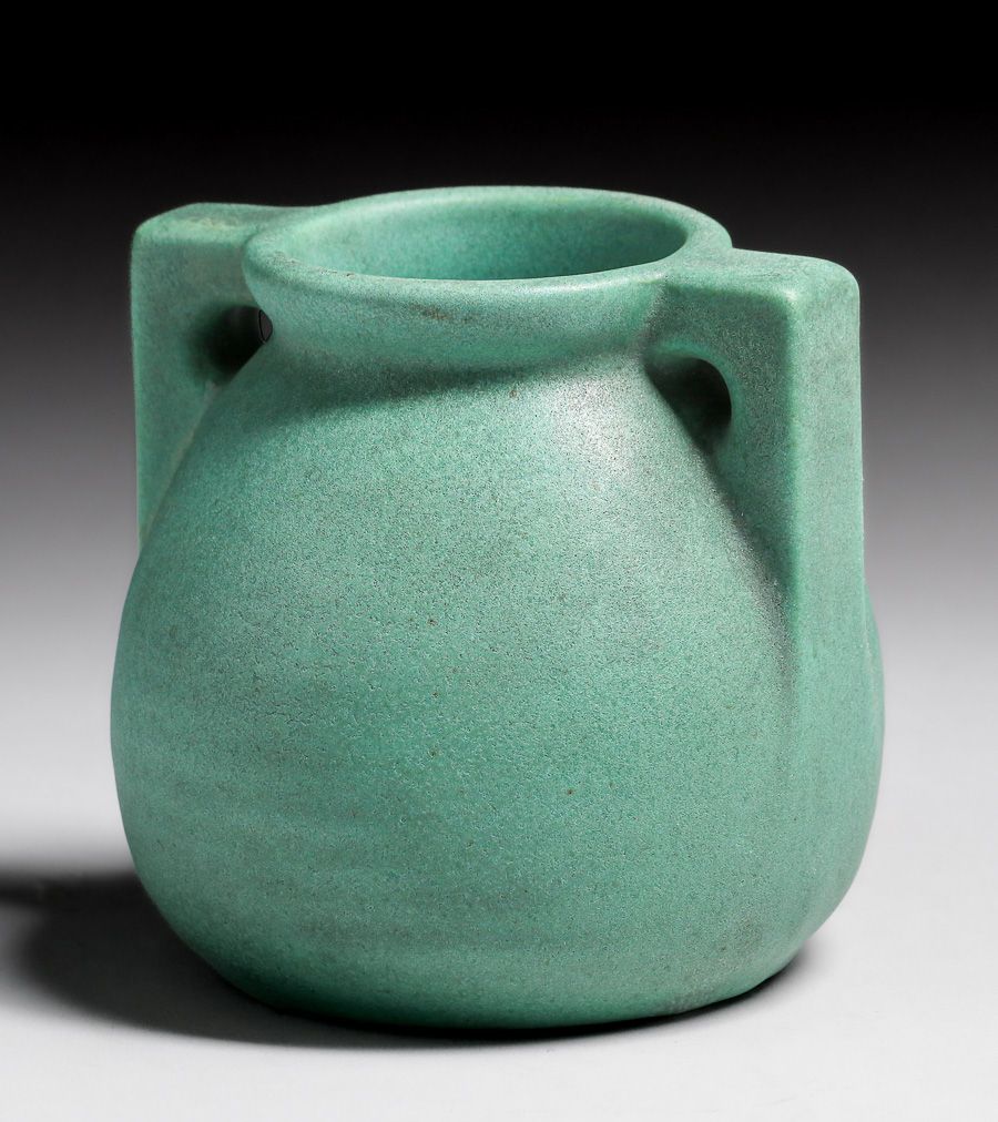 Teco Pottery #426 Matte Green Two-Handled Vase c1910. Signed. Invisible professional restoration to small edge chip to handle, otherwise perfect condition. 3.75”h x 4”d SOLD
