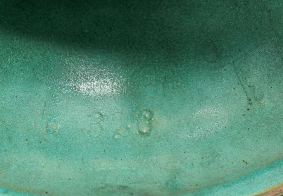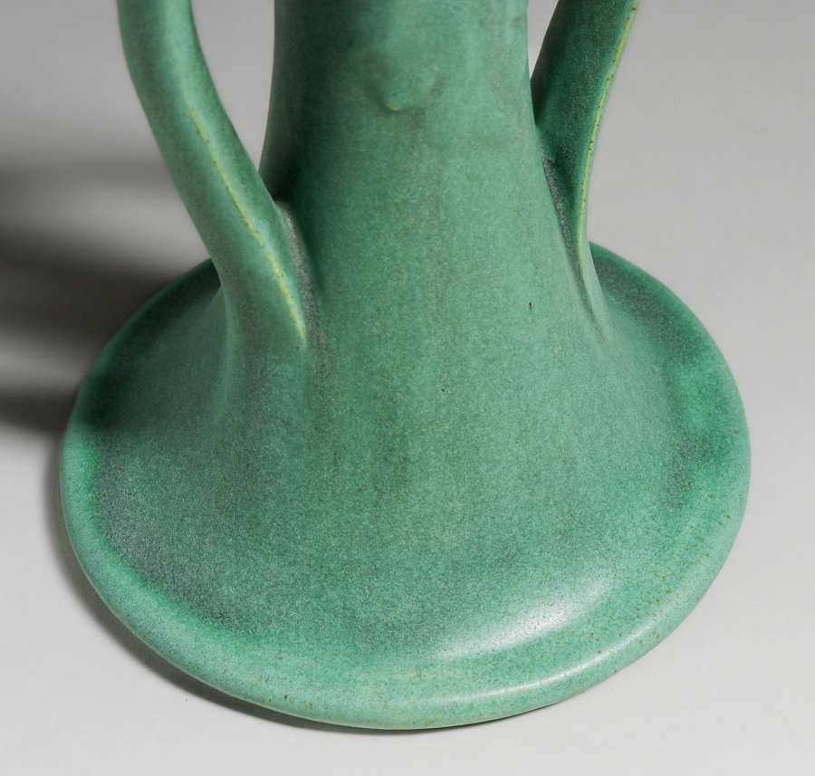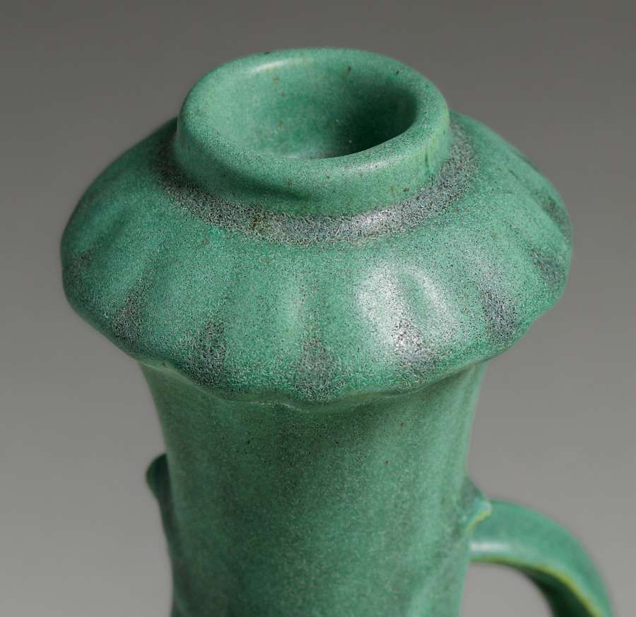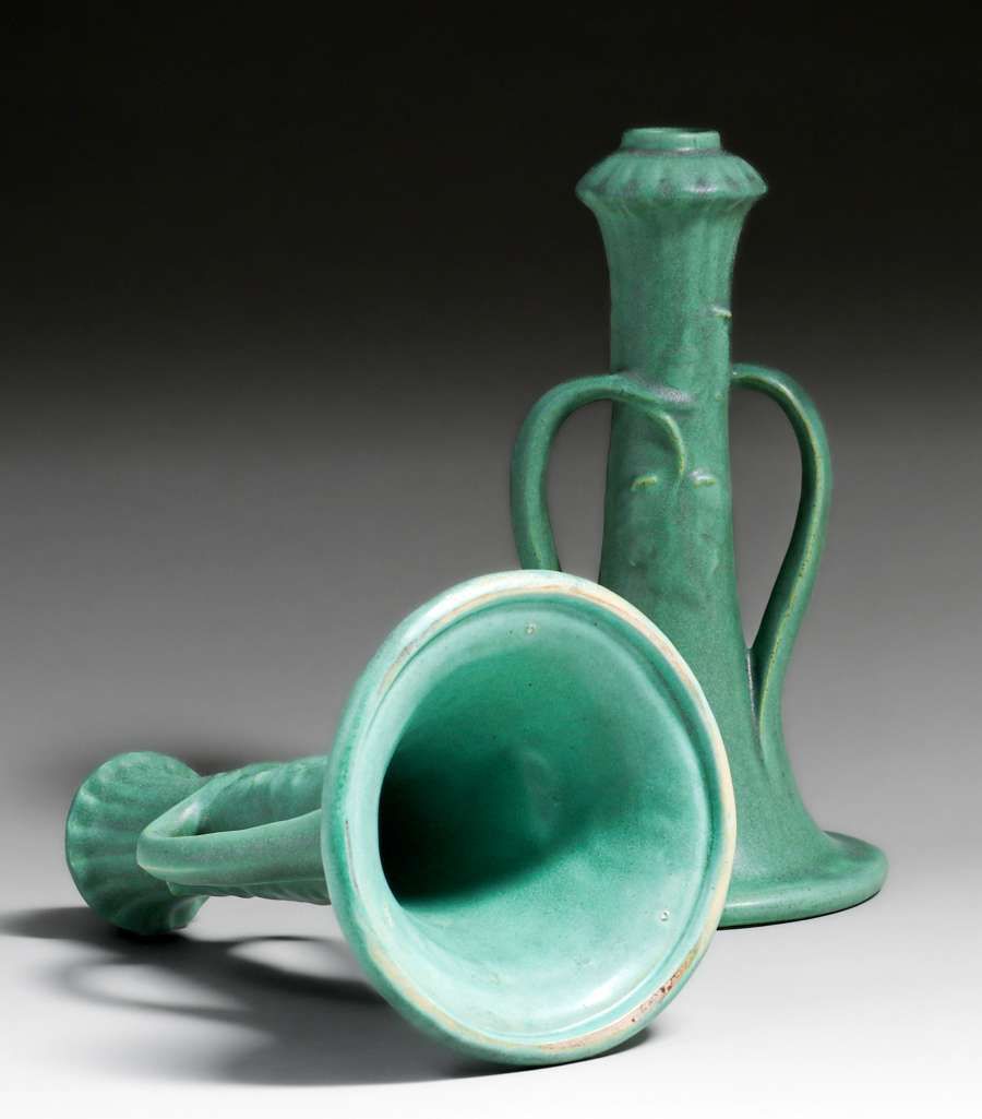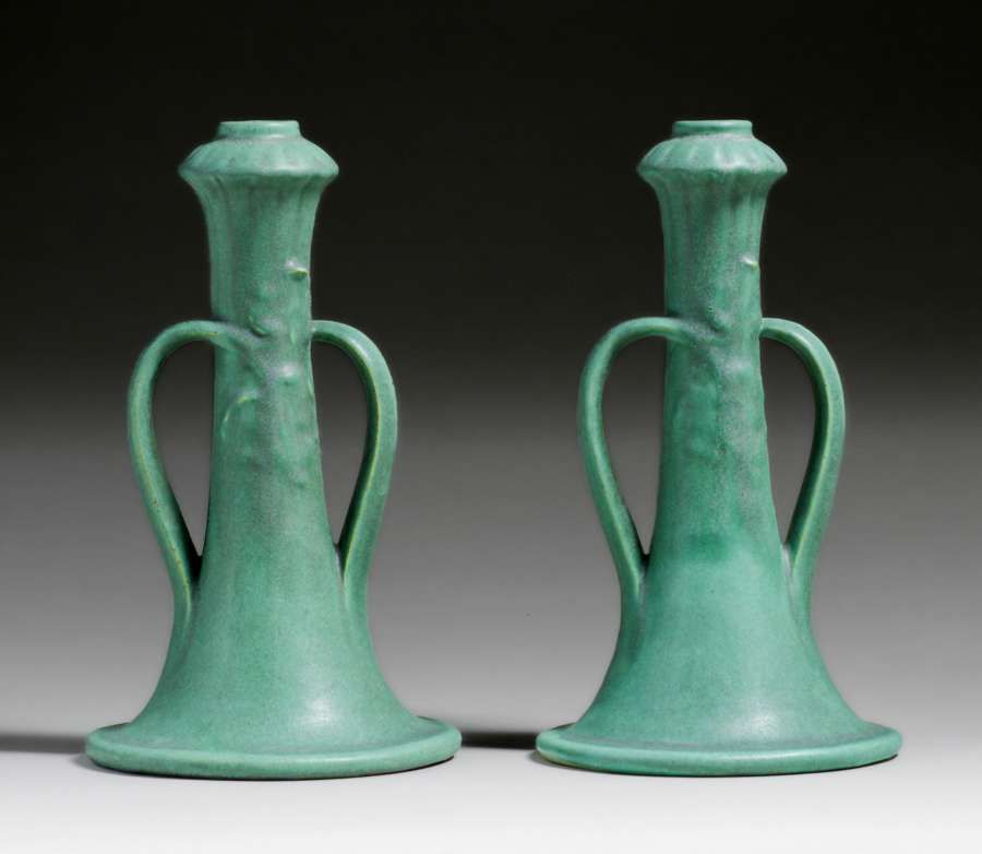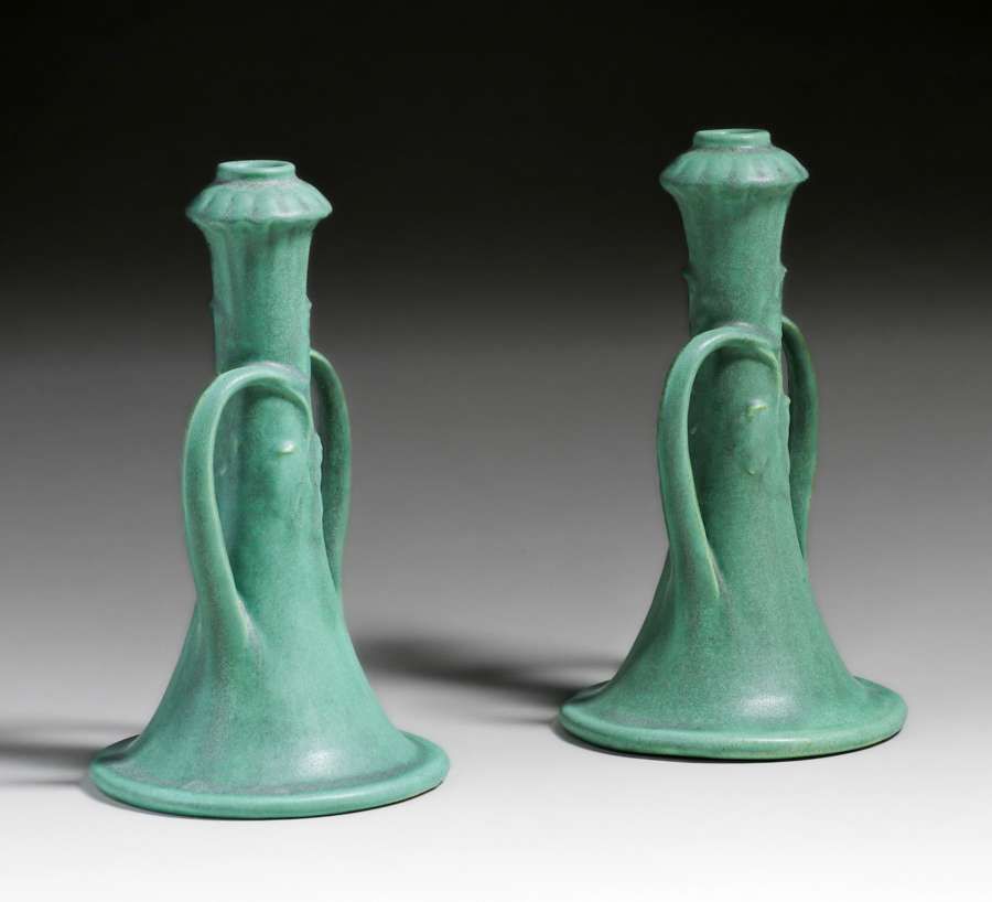 - Teco Pottery Art Nouveau Matte Green Two-Handle Candlesticks c1905