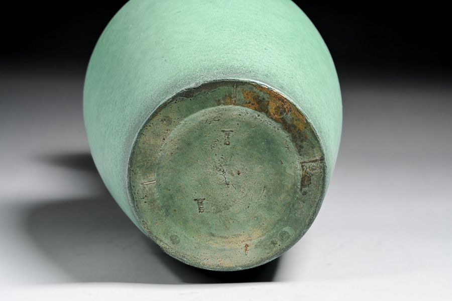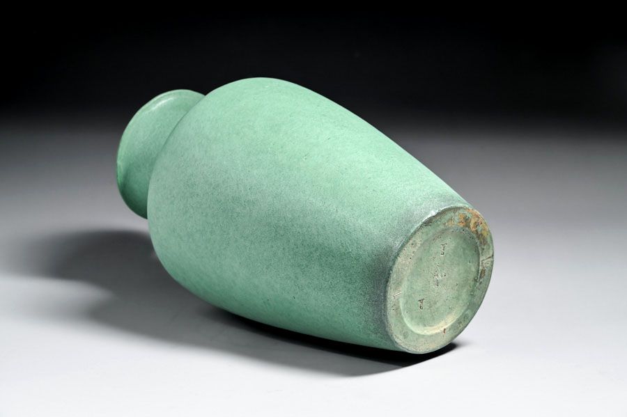 Teco Pottery #G41 Monumental Matte Green Floor Vase c1910. Signed. Invisible professional restoration to small firing separation in base and some some grinding chips to base, otherwise perfect condition. 20"h x 11"d SOLD