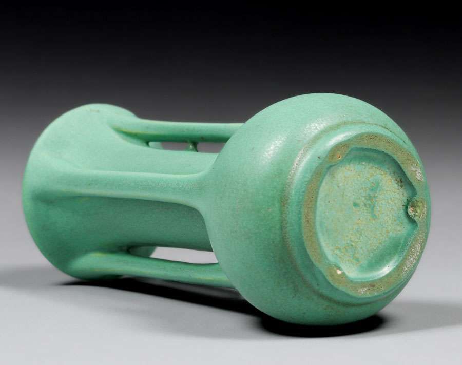 Teco Pottery Matte Green Four-Handle Vase c1910. Signed. Perfect condition. 7"h x 3.25"d SOLD