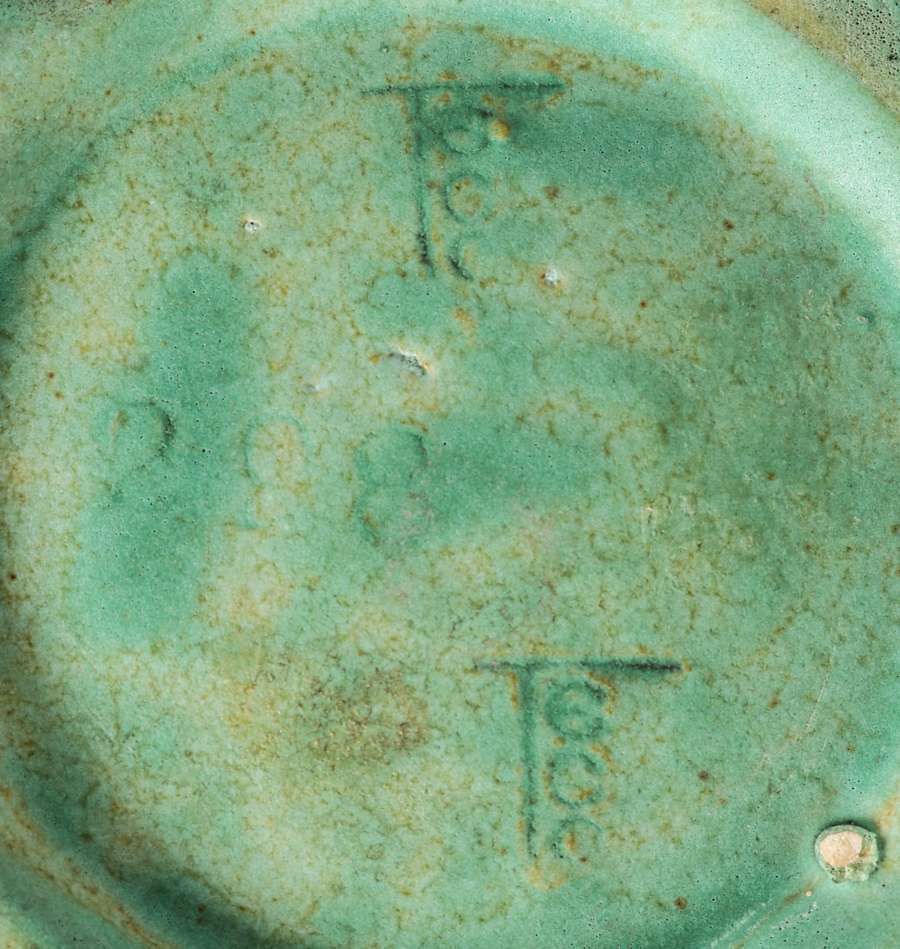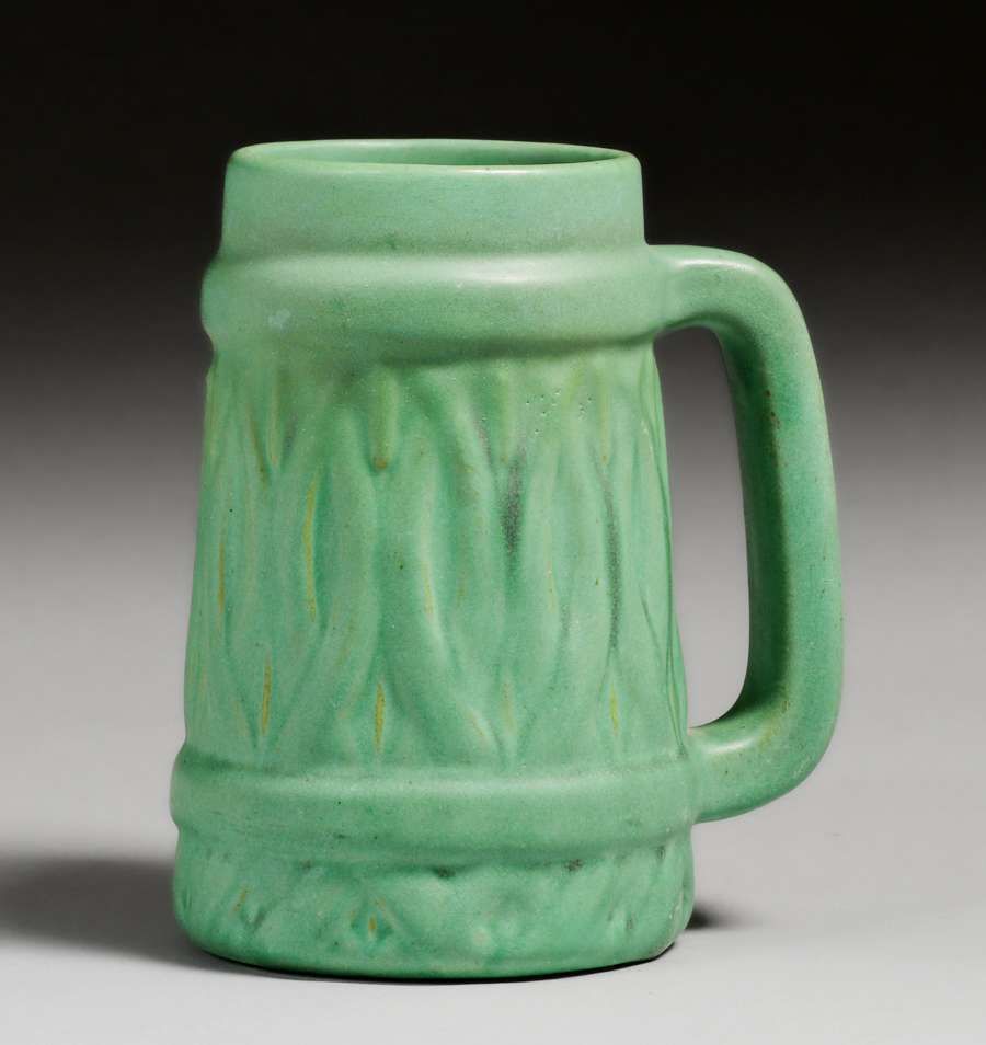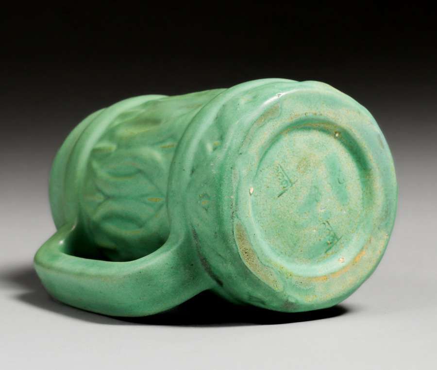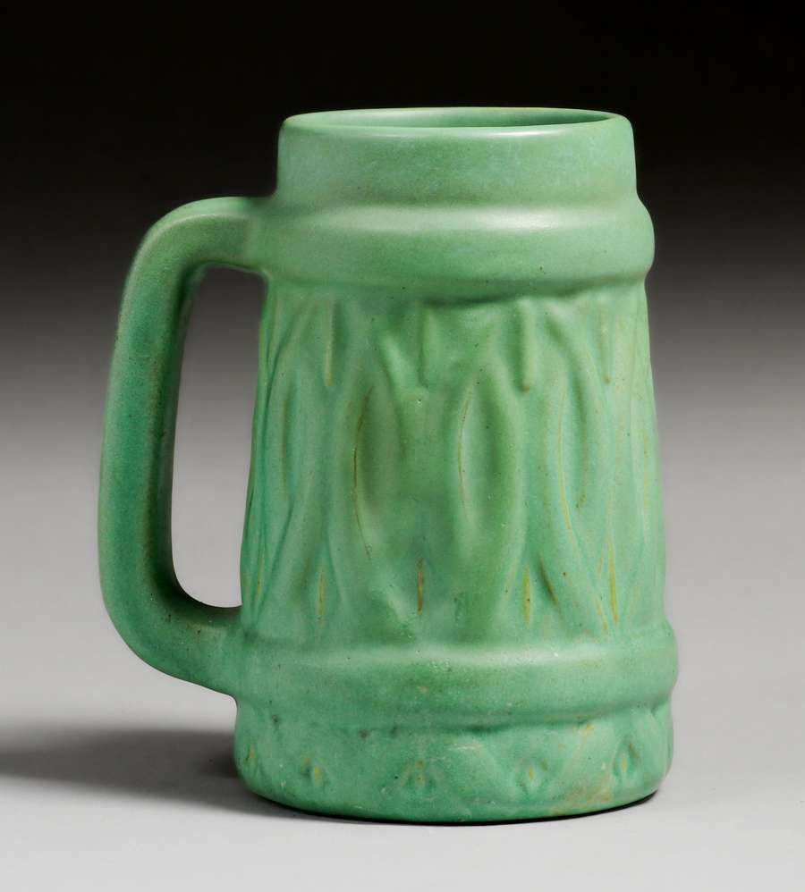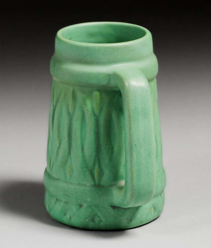 Teco Pottery Matte Green Mug c1910. Signed. Nearly invisible restoration to rim. 6"h x 4.75"w SOLD