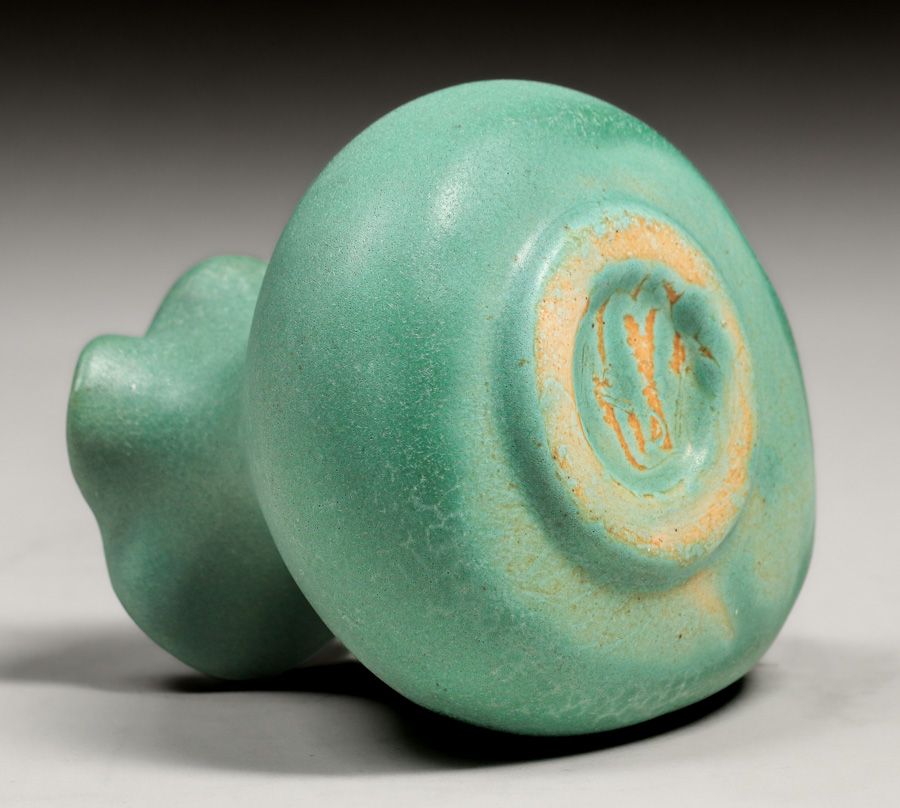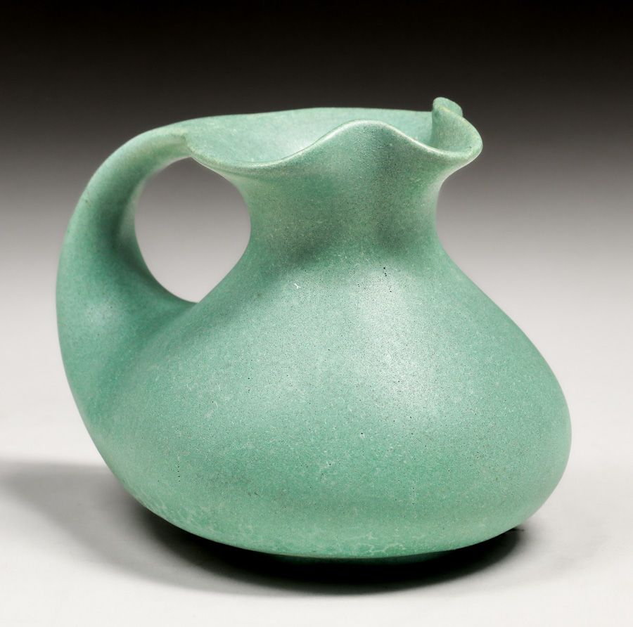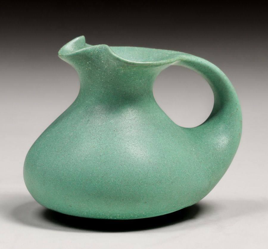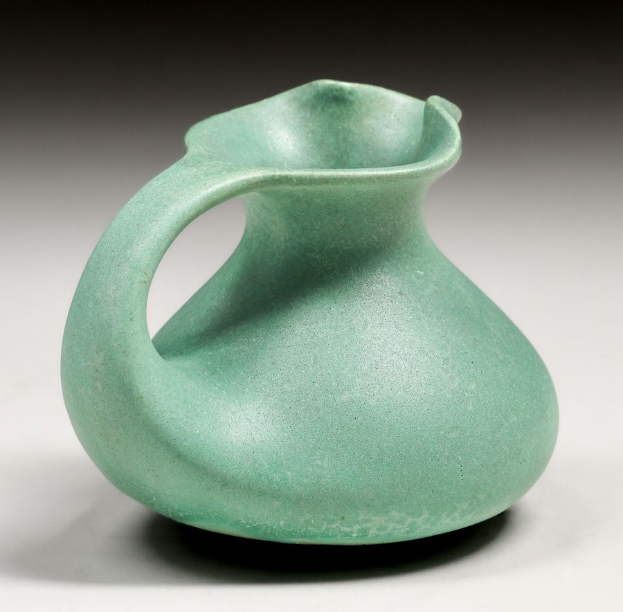 Teco Pottery Matte Green Pitcher c1910. Signed. Perfect condition. 4″h x 4.75″w $950