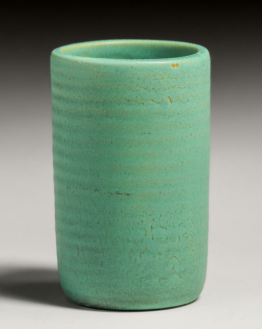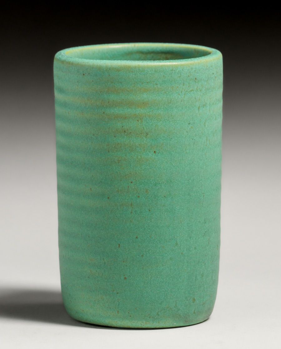 - Teco Pottery Matte Green Ribbed Cylinder Vase c1910