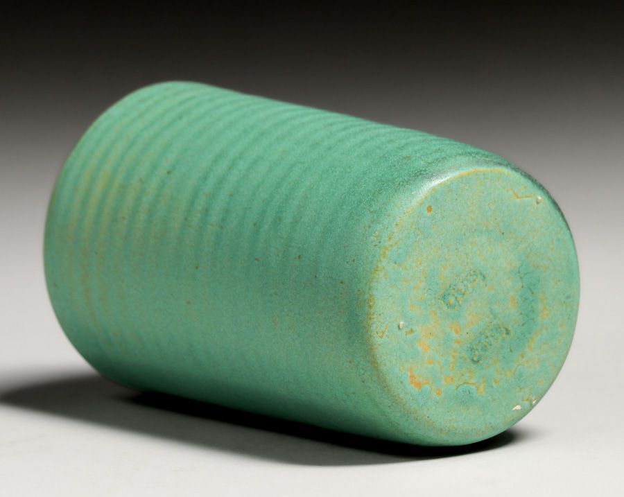 Teco Pottery Matte Green Ribbed Cylinder Vase c1910. Signed twice. Perfect condition. 4.5"h x 2 7/8"d SOLD