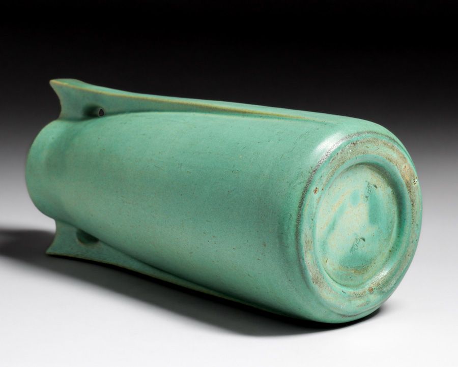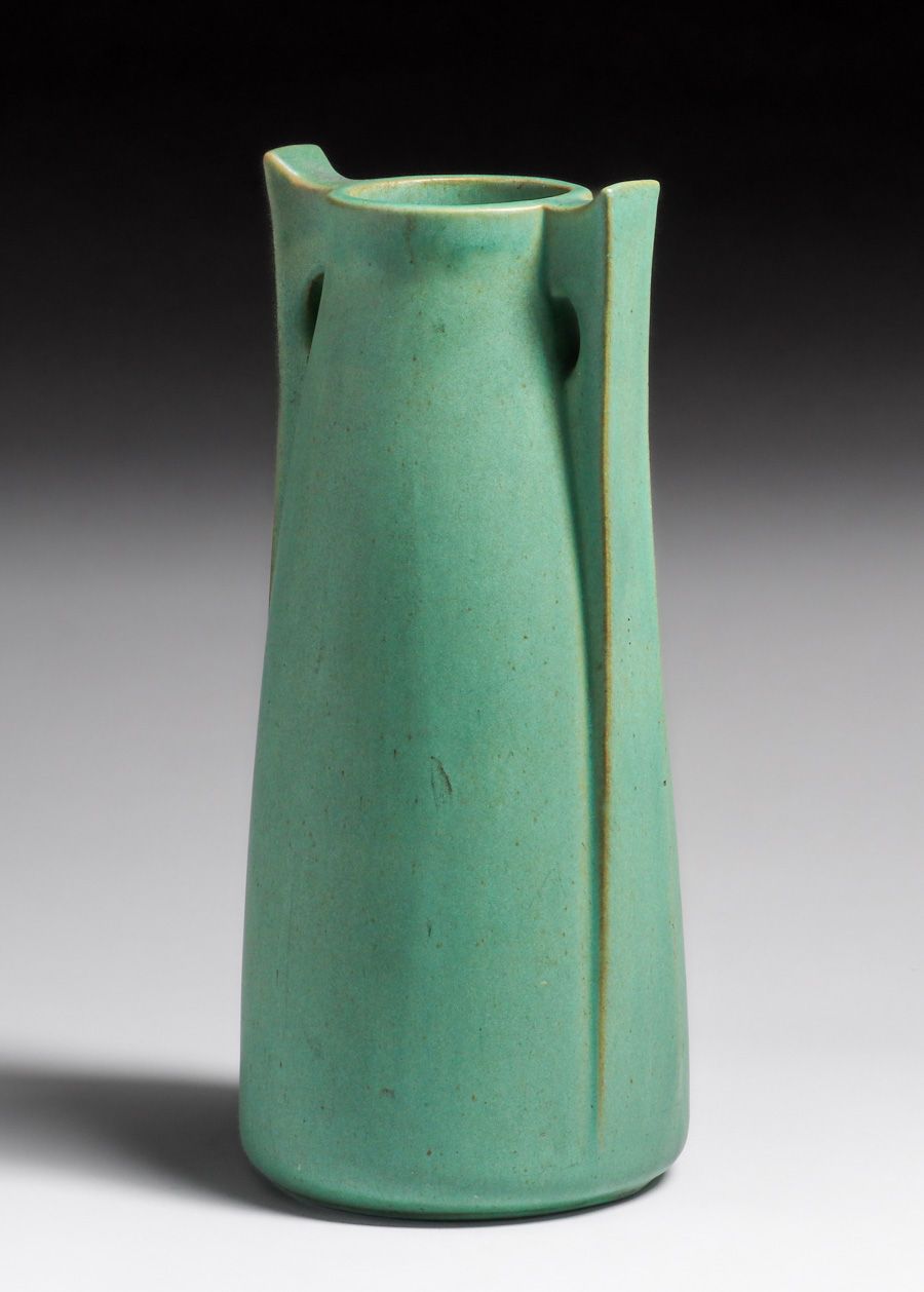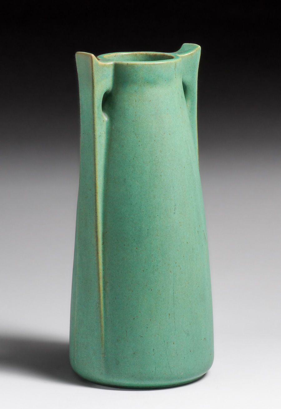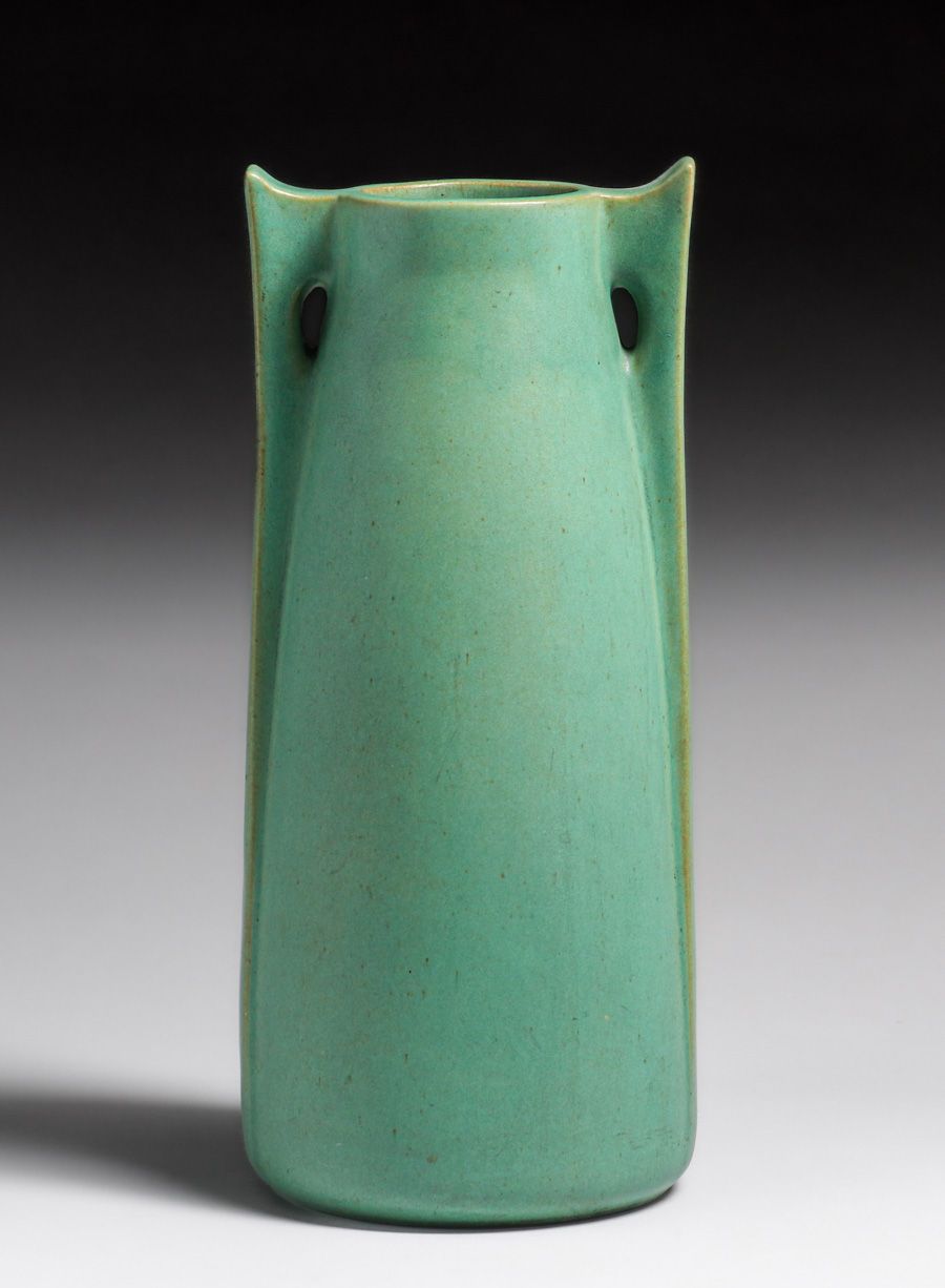 Teco Pottery Prairie School #266 Matte Green Two-Handled Vase c1910. Signed. Nearly invisible professional restoration to one handle, otherwise perfect condition. 11.25″h x 4.75″w SOLD