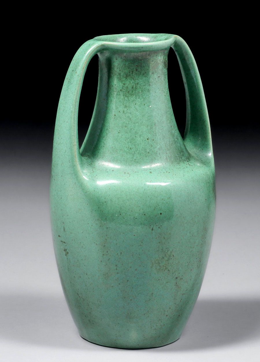 Teco Pottery Semi-Matte Green Two-Handled Vase c1910. Signed. Invisible professional restoration to small rim chip, otherwise perfect condition. 9"h x 5"d SOLD