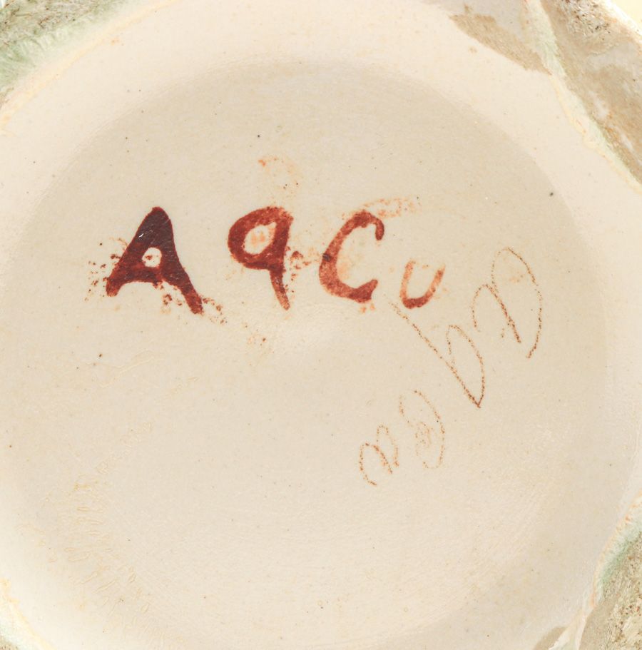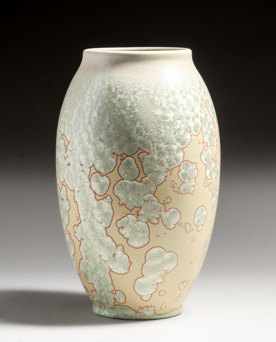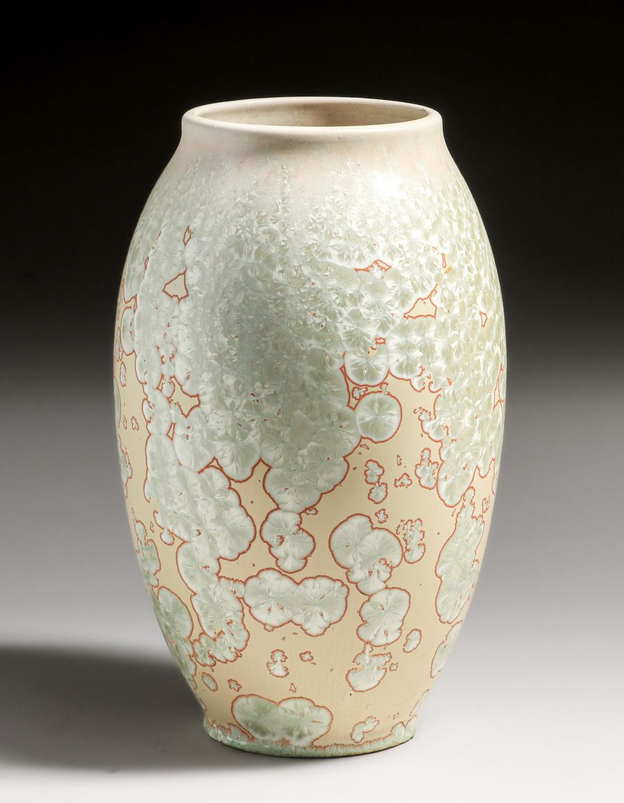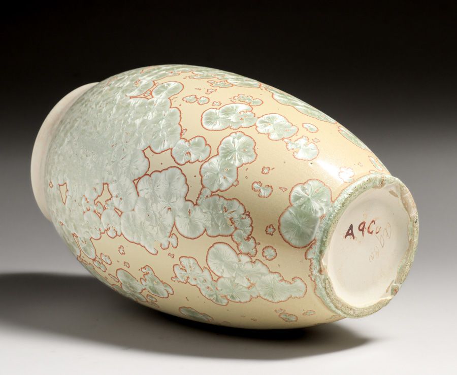 Large Thomas Gotham Crystalline Vase c1924-1927. One of the best crystalline Gotham vases we have ever seen. Signed with cryptic glaze markings. Perfect condition. 13.25″h x 7.5″d SOLD
