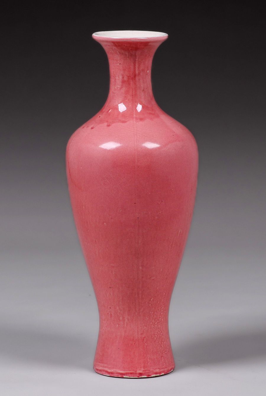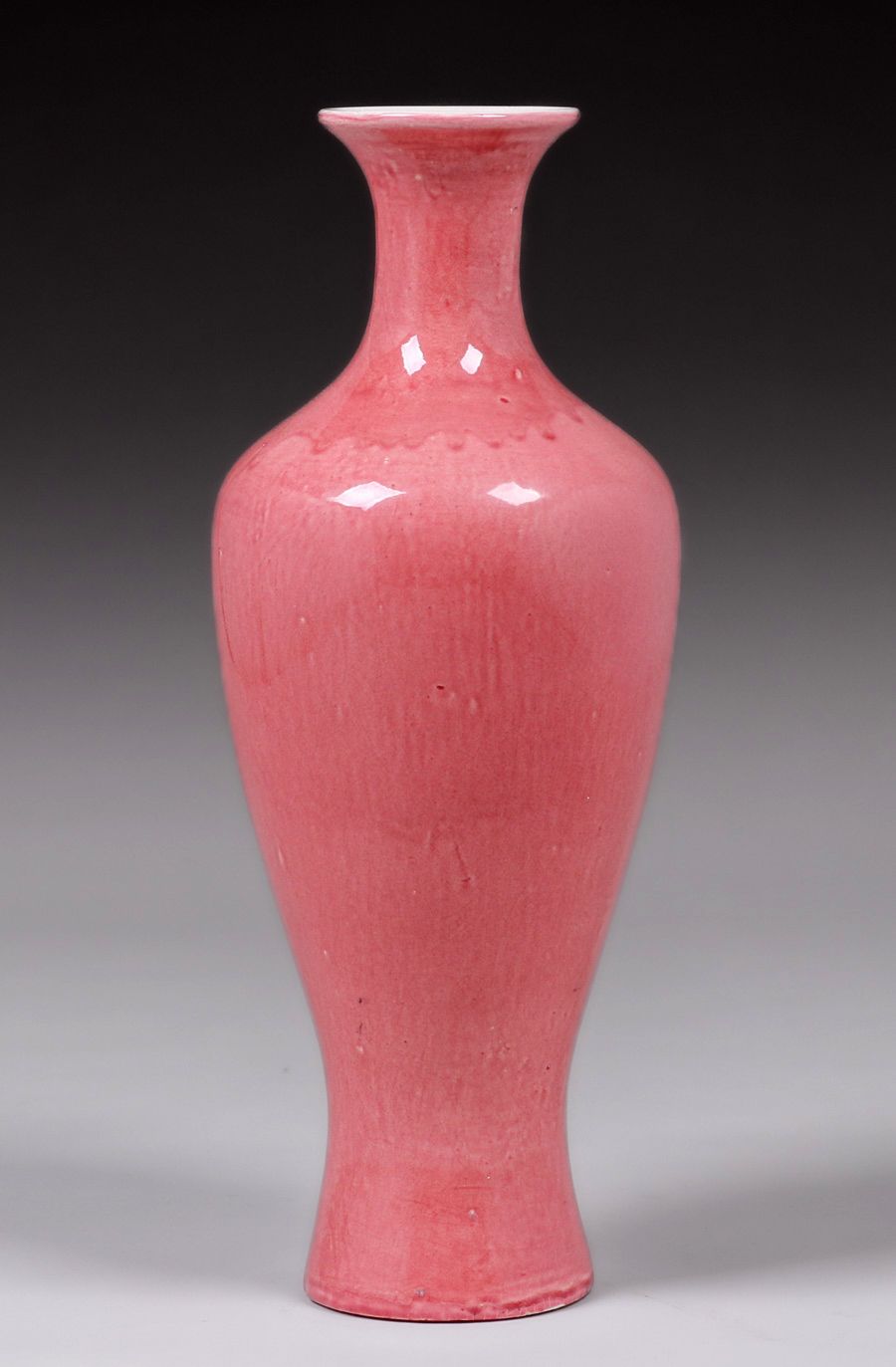 Tall Thomas Gotham – West Coast Porcelain Strawberry Crackleware Floor Vase c1920s. Unsigned. Post-production drill for a lamp base. Several minor glaze imperfections (glaze bubbles). From the Collection of Kirby Brown, author of the California Faience Book. 22.75″h x 8.25″d SOLD