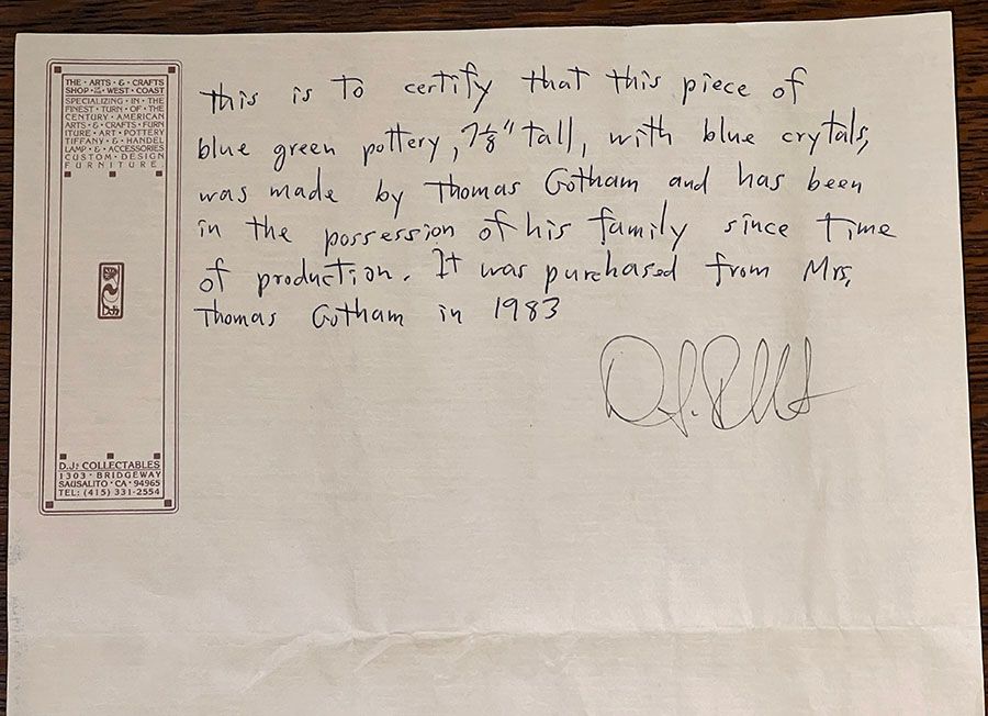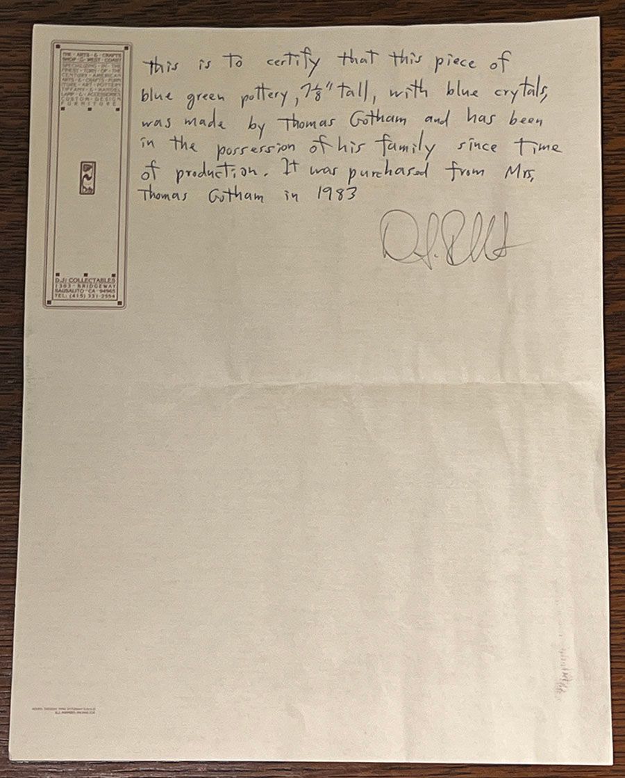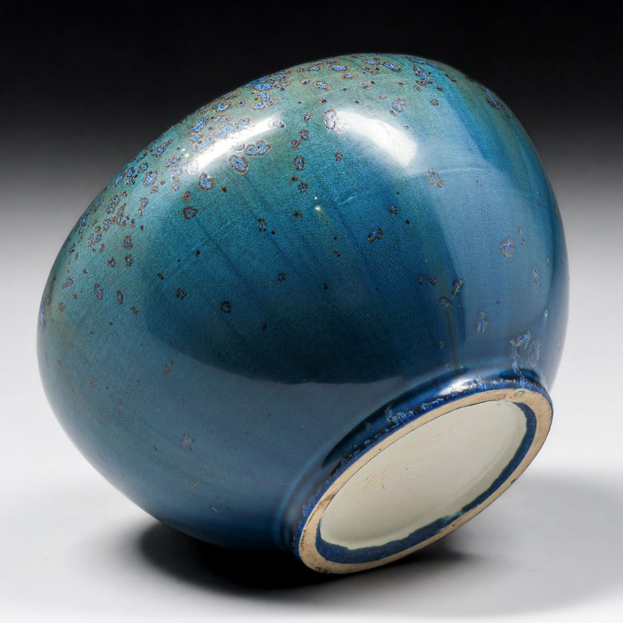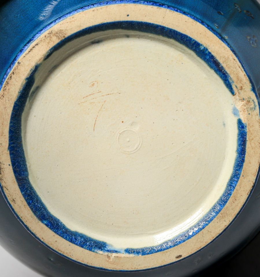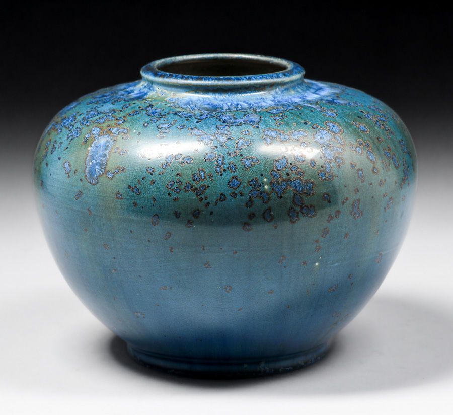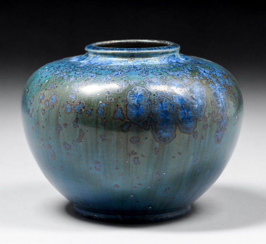 Thomas Gotham Deep Blue Crystalline Bulbous Vase c1927. A fantastic example of Gotham's range in crystalline glazes. Unsigned. Perfect condition. Provenance: Comes with a Letter from DJ Puffert of the Arts & Crafts Shop of the West Coast acknowledging that this vase came from Mrs Thomas Gotham in 1983. 10"d x 7 1/8"h SOLD