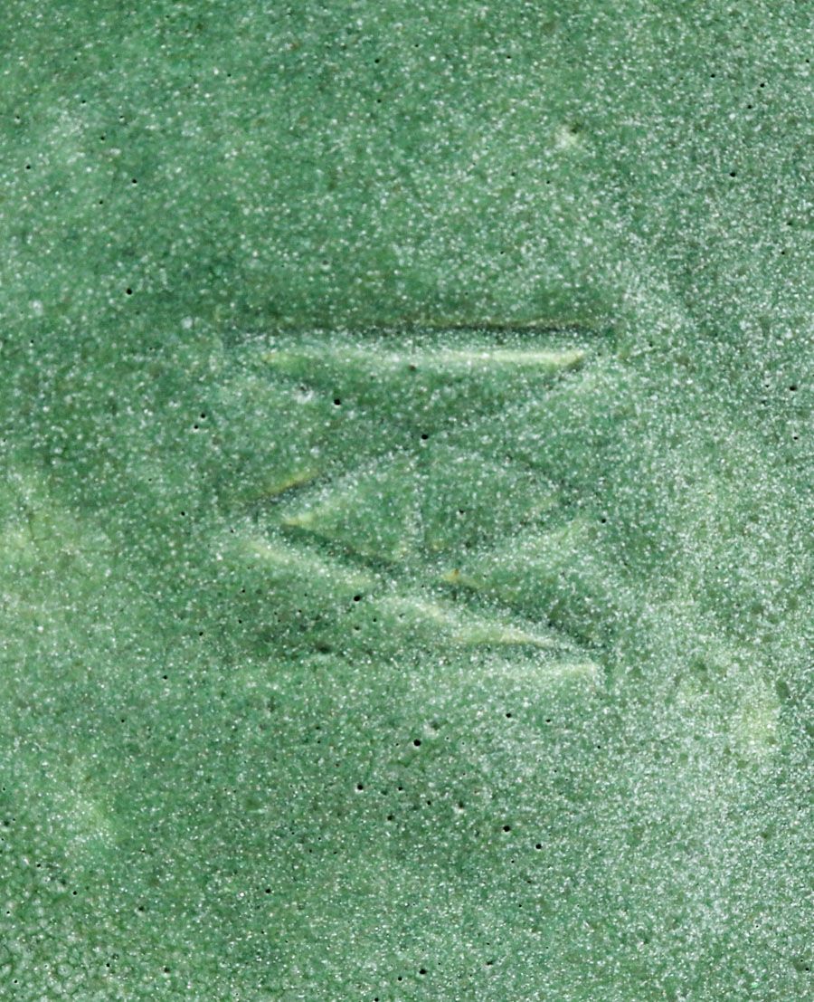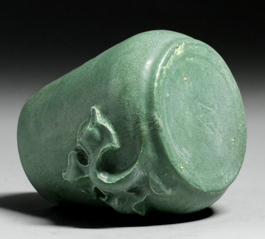 Early Valentien Pottery – San Diego, CA Matte Green Vase Anna Marie Valentien c1908. Albert & Anna Marie Valentien were both artists that worked for Rookwood Pottery. They both visited San Diego in 1903 and then moved there in 1908 after retiring from Rookwood. Signed with her early conjoined initials. Small glaze skip to interior of rim. Perfect condition. 7”h x 6”d SOLD