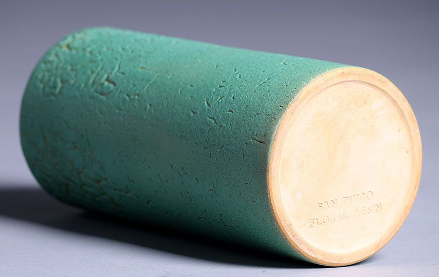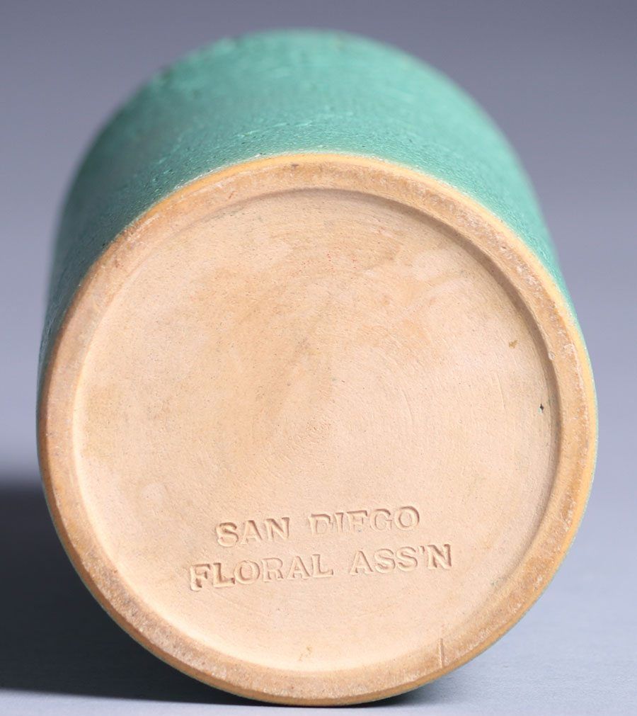 Valentien Pottery cylinder vase made for the San Diego Floral Association. Marked "San Diego Floral Ass'n". Amazing curdled matte green glaze. Invisible professional restoration to small base chip. 9"h x 4"d SOLD