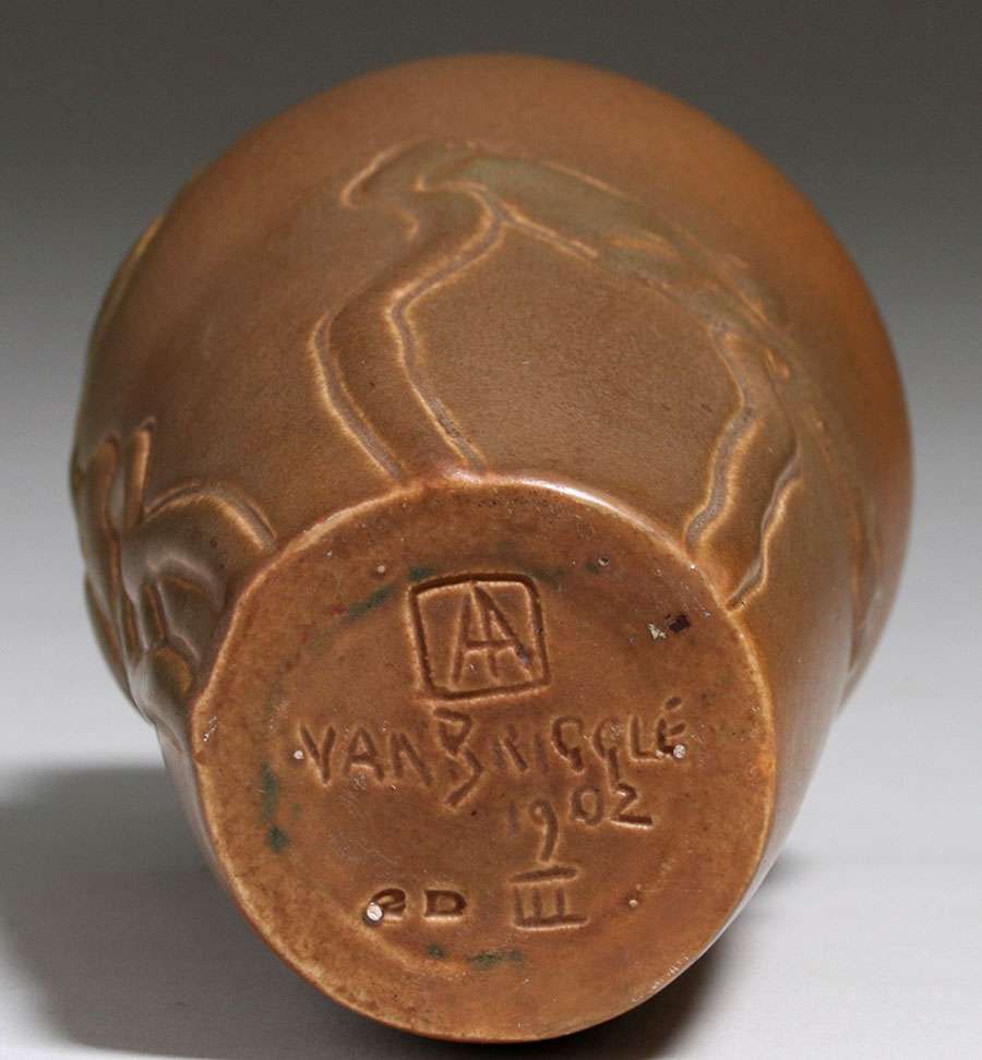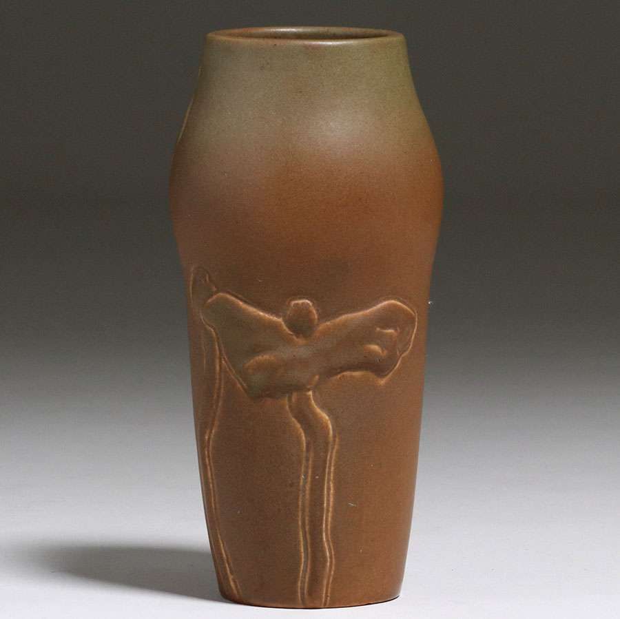 Early Van Briggle 1902 Poppies Vase. Invisible professional restoration to base, small tight hairline to rim otherwise perfect condition. 7.75"h x 4"d SOLD
