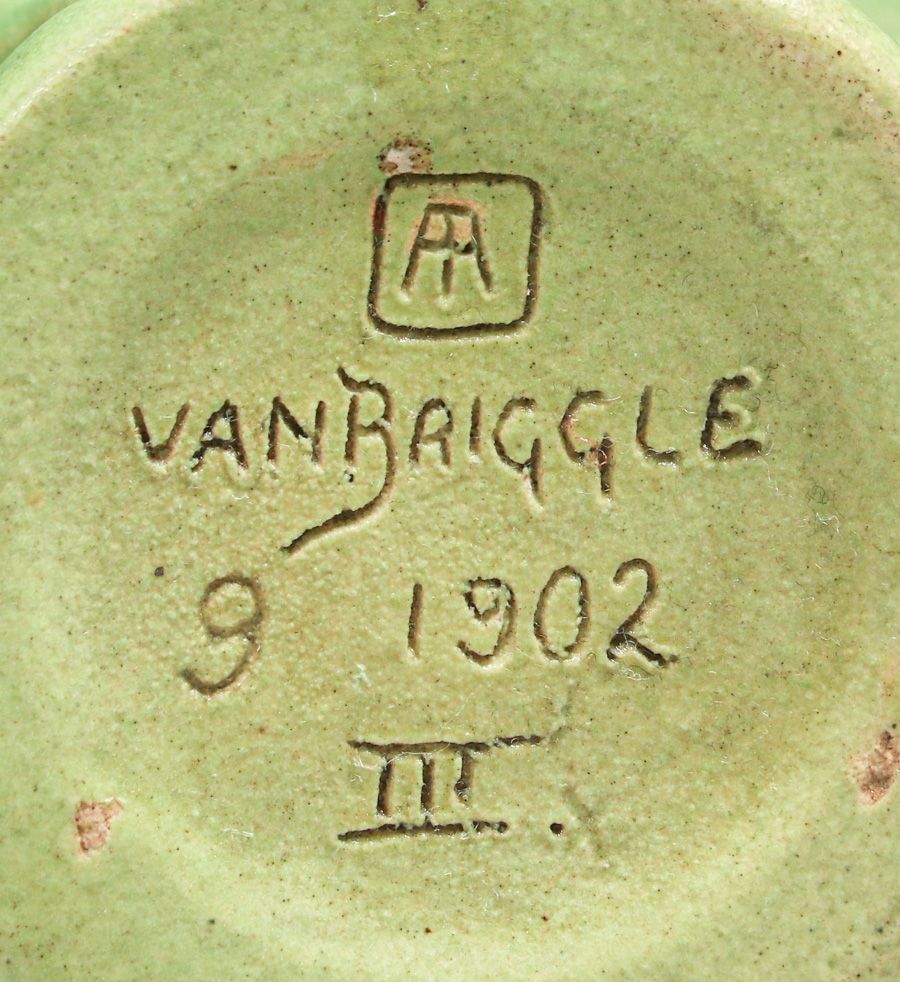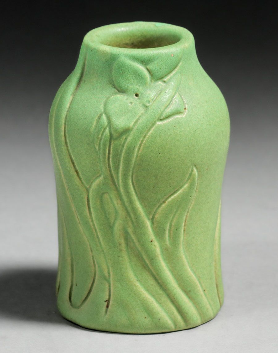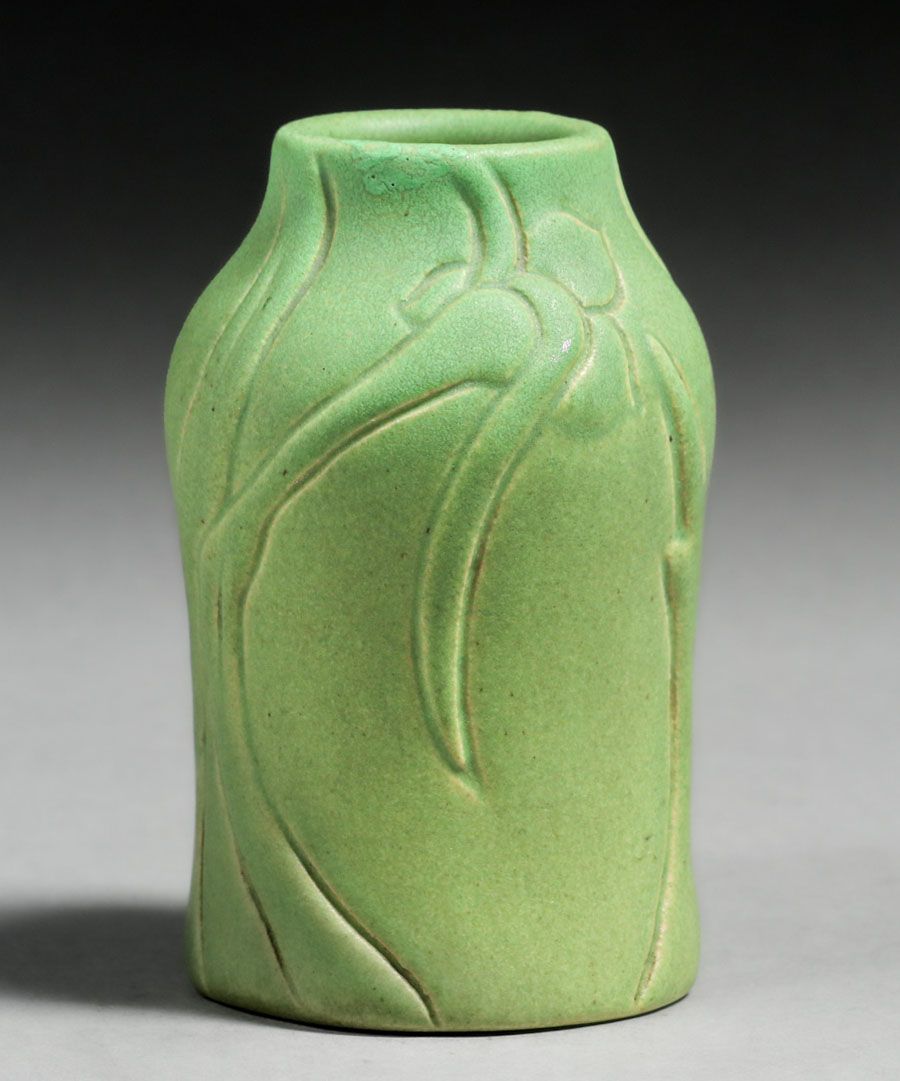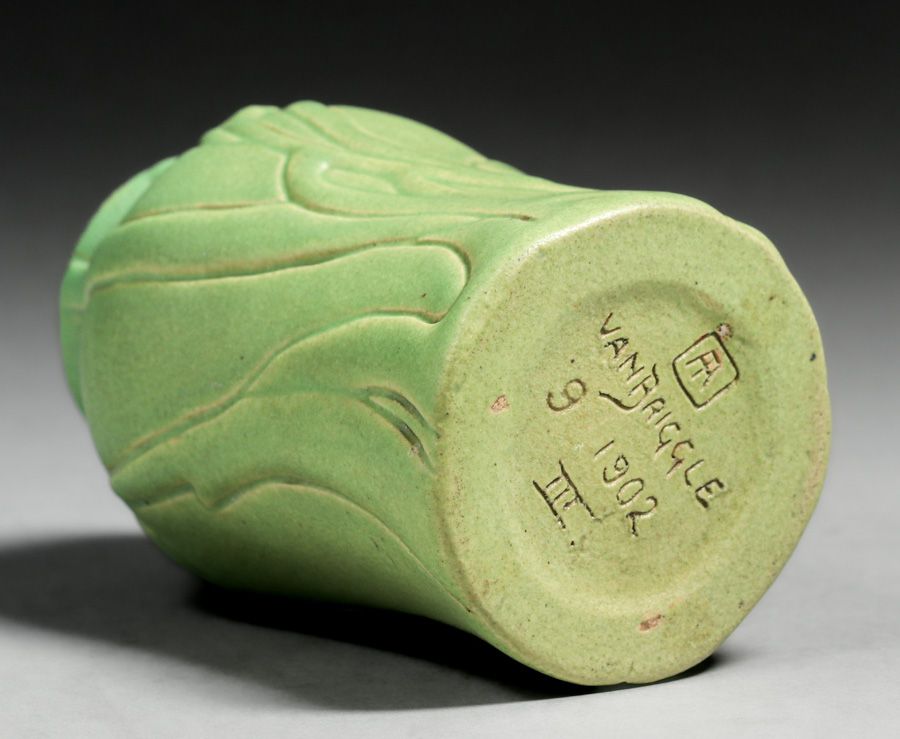 Early Van Briggle Matte Green Vase 1902. Signed. Firing anomaly on rim, otherwise perfect condition. 4 3/8"h x 2.5"d SOLD