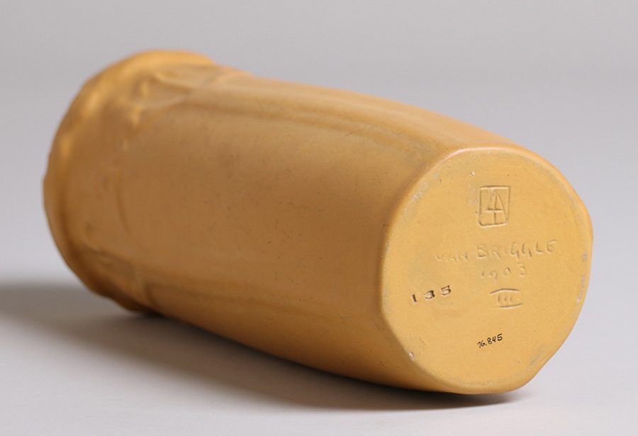 Early Van Briggle matte mustard vase #135 dated 1903. This is an important, early vase, designed by Artus Van Briggle and executed before his death in 1904. Tight interior hairline barely crests rim and minute glaze bubbles throughout. 10"h x 4"d SOLD