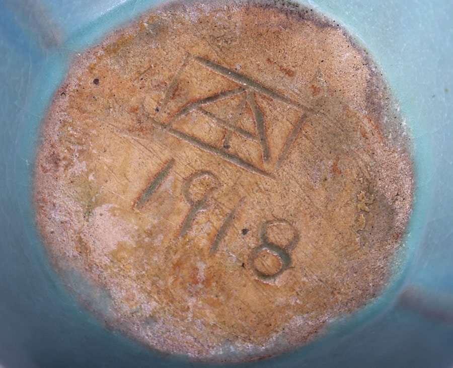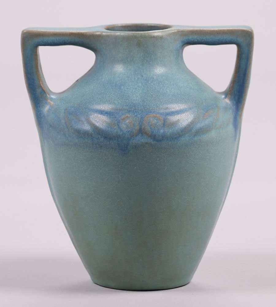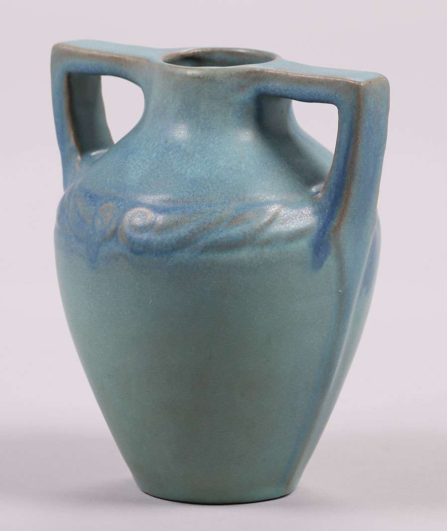 Early Van Briggle matte blue two-handled vase dated 1918. Invisible professional restoration to edge chip to handle. 7.5"h x 6.75"w SOLD
