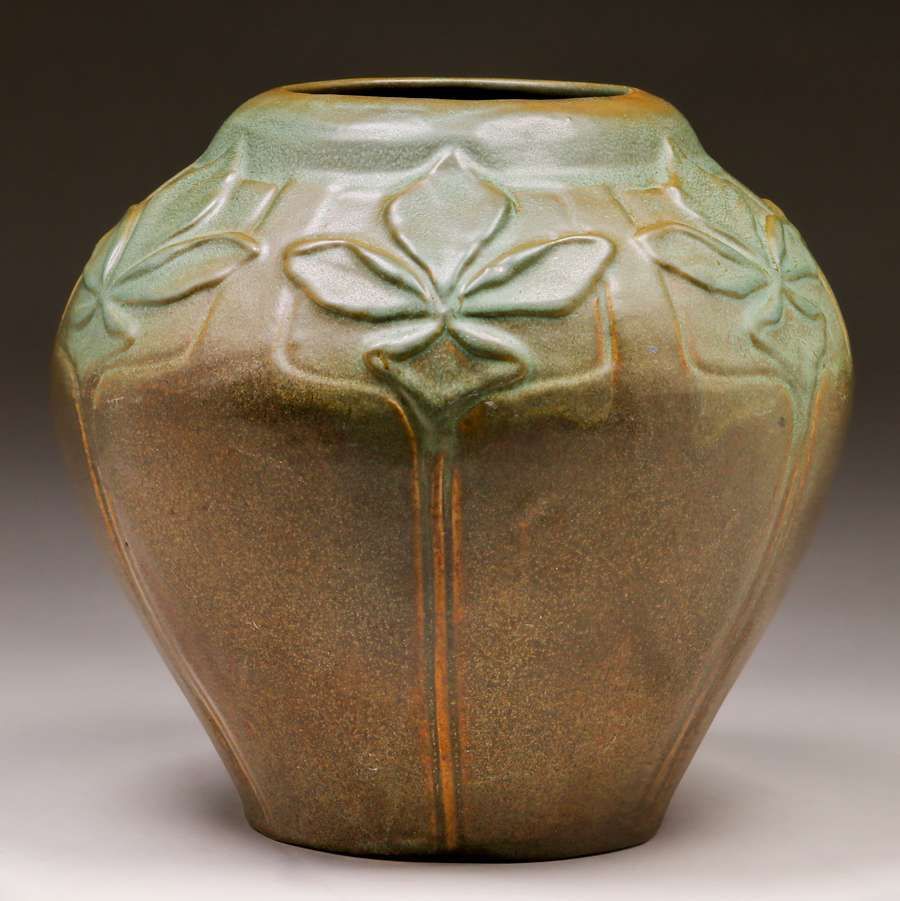 Large Van Briggle Bulbous Vase 1910. Signed. Invisible professional restoration to glaze flakes on base, otherwise perfect condition. 10.5"h x 11"d SOLD