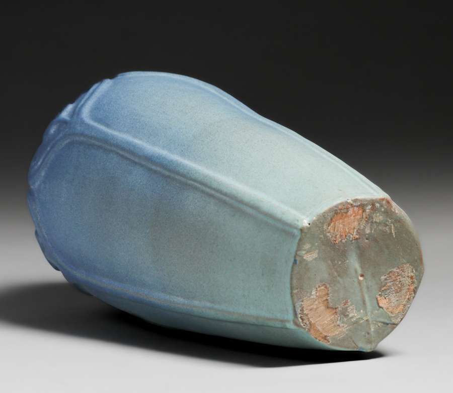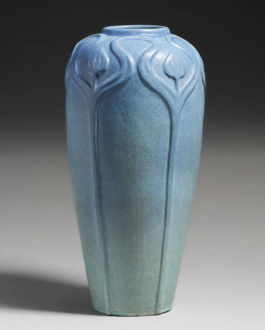 Large Van Briggle Matte Blue Vase c1907. Glazed over signature. Perfect condition. 15"h x 6.5"d SOLD