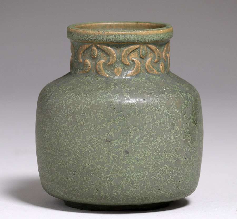 Van Briggle vase with a fantastic matte green slightly curdled glaze c1908-1911. Perfect condition. 4.75"h x 4.5" SOLD