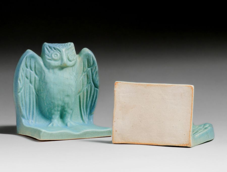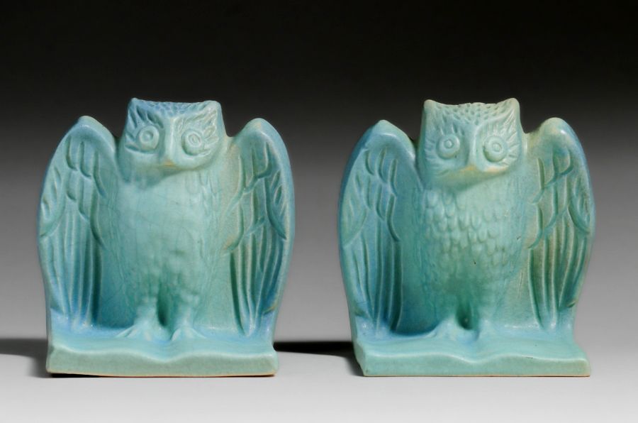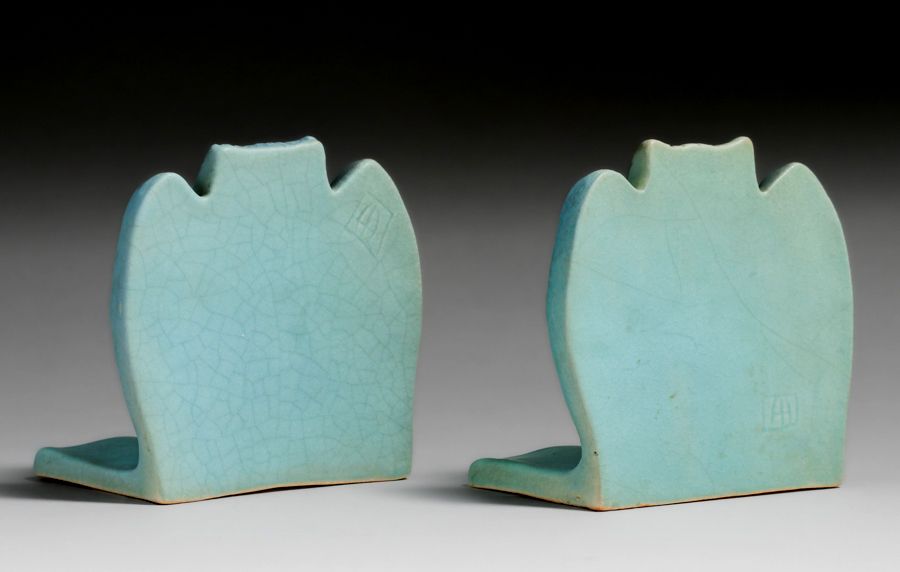 Van Briggle Owl Bookends c1920s. Signed. Heavy crazing, otherwise perfect condition. 4.75h x 4.75w inches SOLD