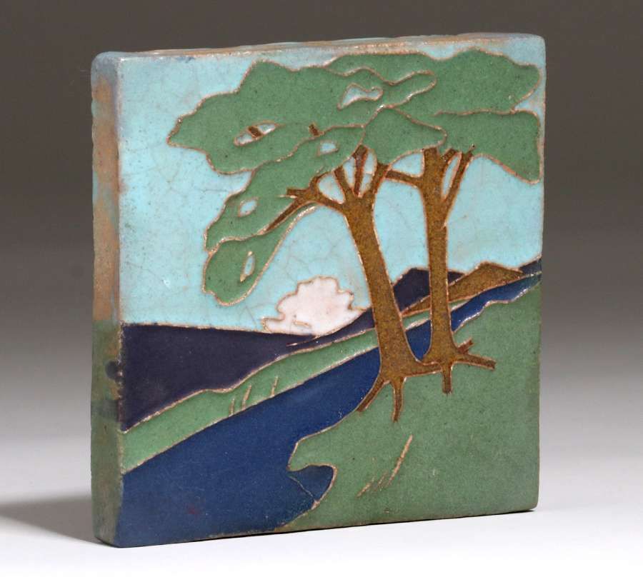 Van Briggle Scenic Pine Tree Tile with multicolor mountain landscape. Unsigned. Invisible professional restoration to small corner chips, otherwise perfect condition. 6″ x 6″ SOLD
