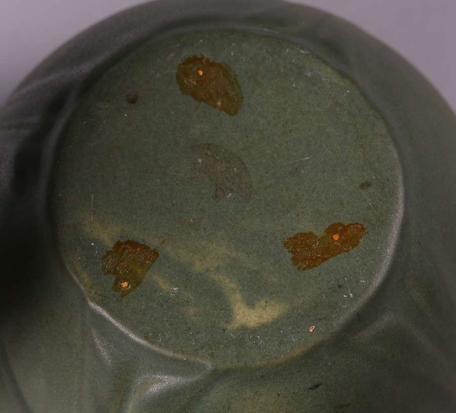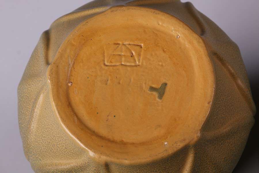 Van Briggle Vases: 1913 Matte Yellow with Green Highlights 9"h SOLD , Dark Matte Green Vase c1907-1911 5"h x 6.5"d SOLD