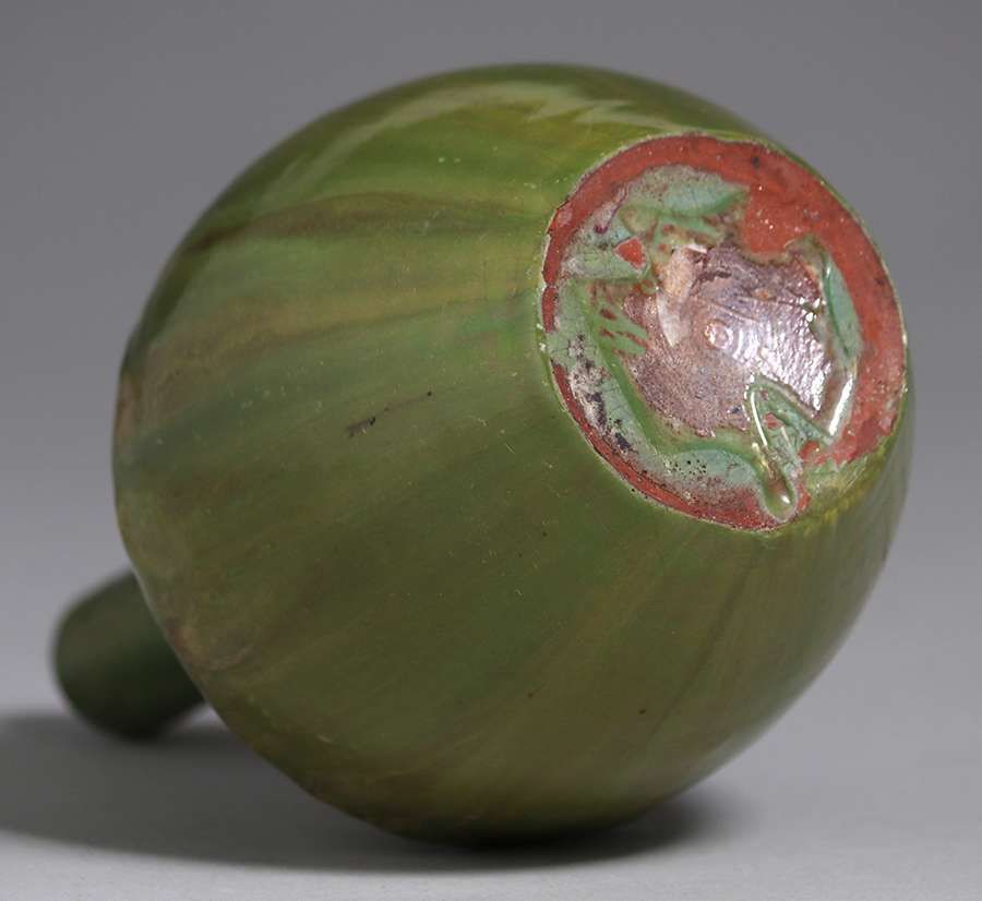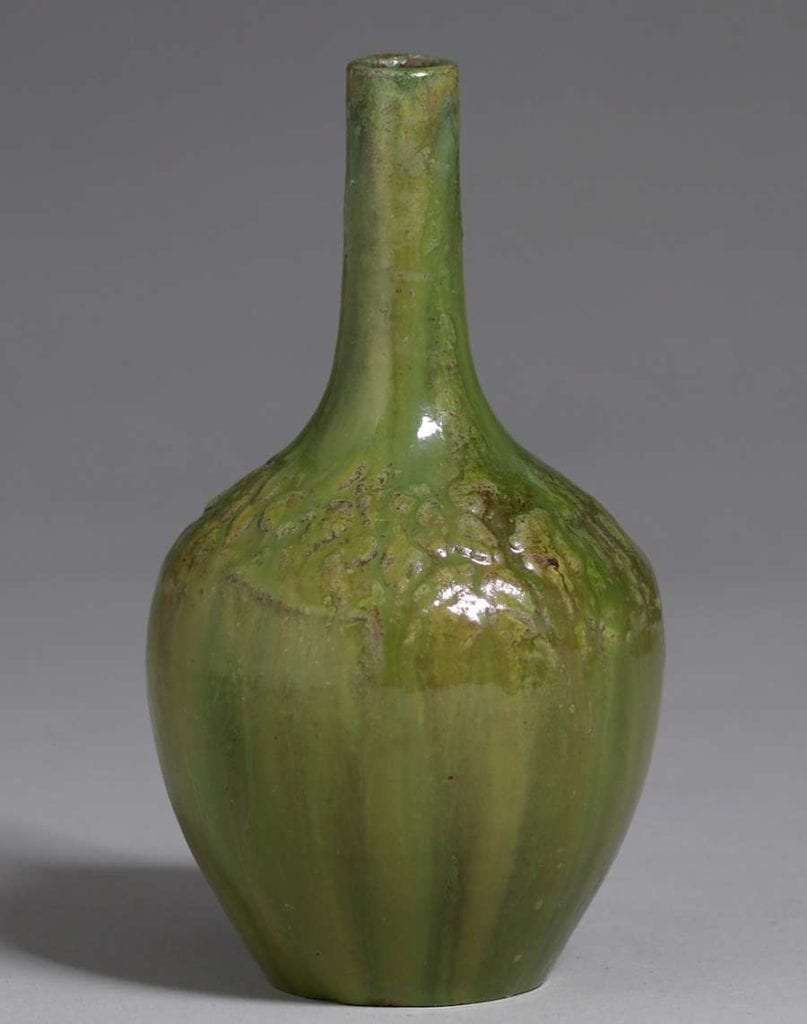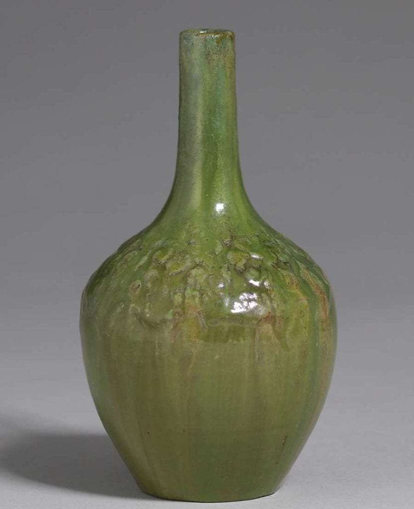 Walley Pottery vase with a thick organic green glaze. Signed. Invisible professional restoration to two small chips, otherwise perfect condition. 6.75″h x 3.5″d SOLD