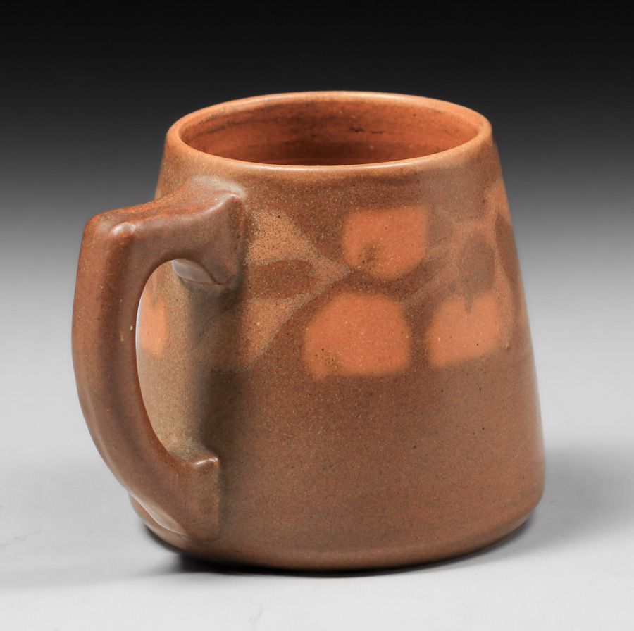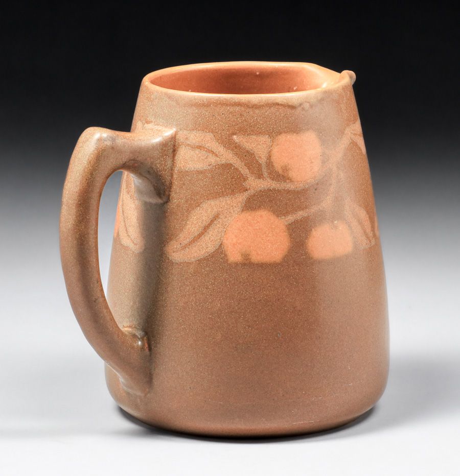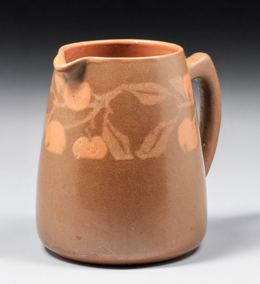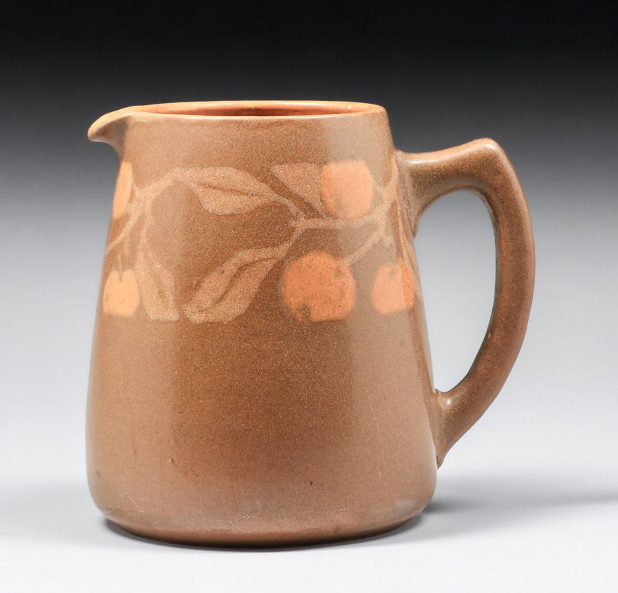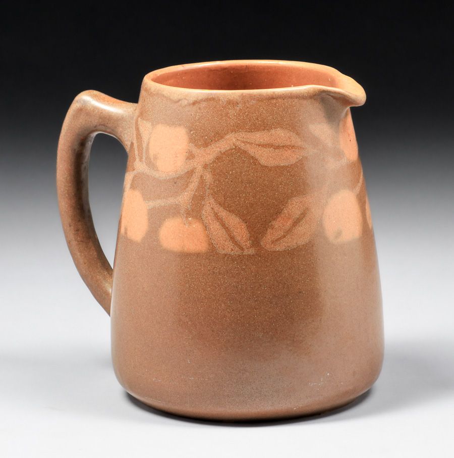 Walrath Pottery Five Piece Cider Set c1910. Signed. A couple of small fleck stores base of mugs, otherwise perfect condition. Pitcher 7.5"h x 7.5"w x 6.25"d. Mugs 3"h x 4.5"w SOLD