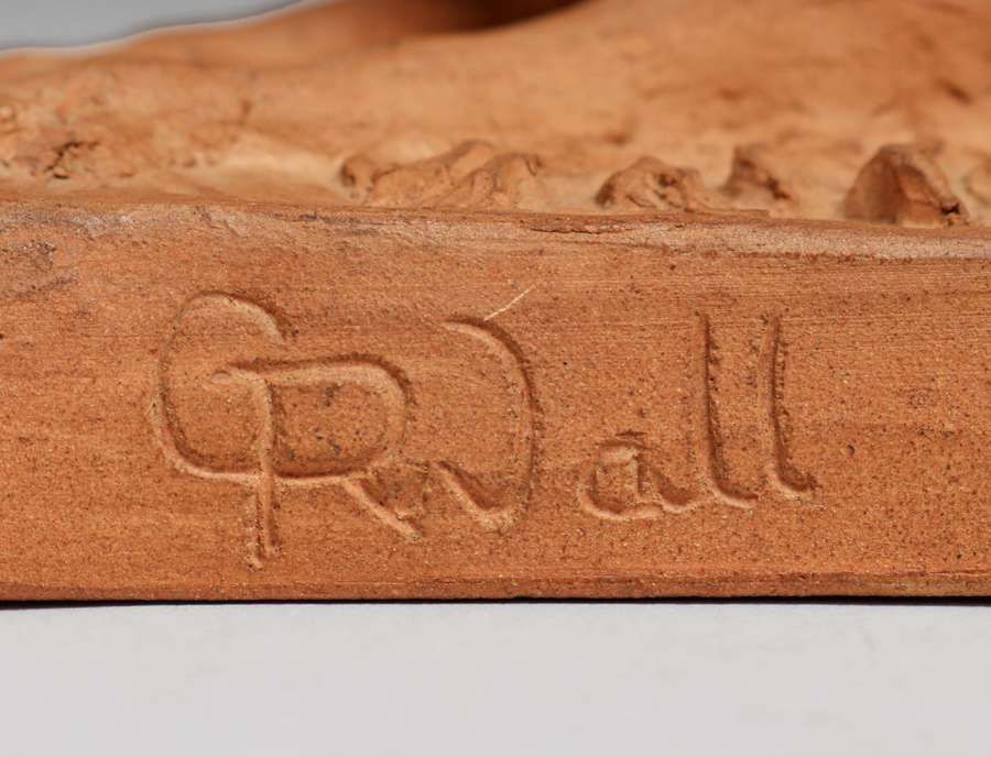 Gertrude Rupel-Wall (1881-1971) Unglazed Ceramic Dog c1920s. “Born in Greenville, OH on Feb. 9, 1881. Gertrude Rupel was a student at the Chicago Academy of Fine Arts and Herron Art Institute in Indianapolis. In 1922 she and her husband, James Wall, established the Walrich Pottery Company where they produced glass tiles and vases until the Depression when production ceased. She was a resident of Berkeley and on the faculty at UC Extension in 1938. Mrs. Wall died in San Mateo County, CA on July 3, 1971. Member: American Ceramic Society; Marin Art Society; SF Women Artists; Bay Region AA. Exh: San Francisco Art Association, 1916; SF Women Artists, 1938; Oakland Art Gallery, 1944 (solo); De Young Museum, 1945 (solo).” Cited from Edan Hughes book Artist’s in California . Signed. A few minor flecks to base, otherwise perfect condition. 7.75″w x 4.25″ x 3.75″h SOLD
