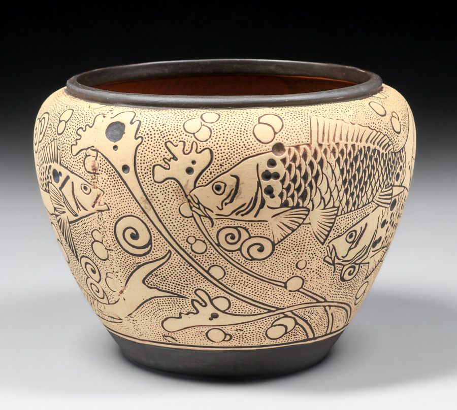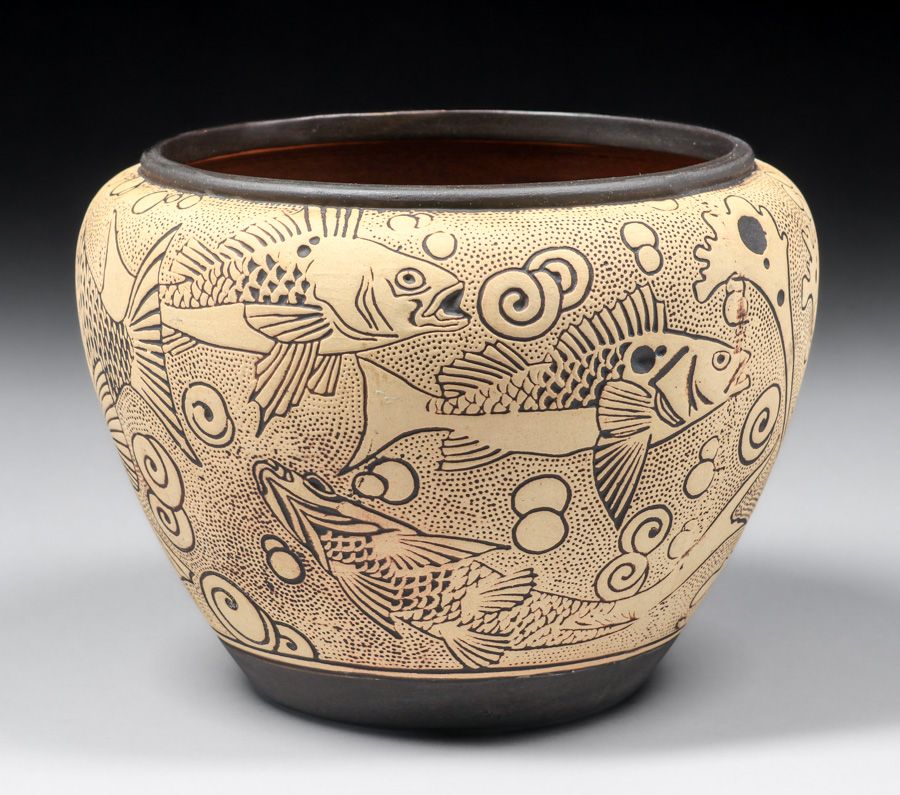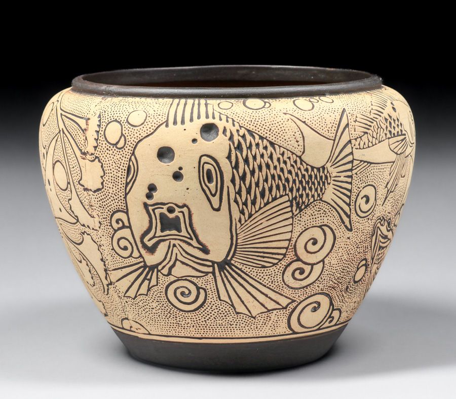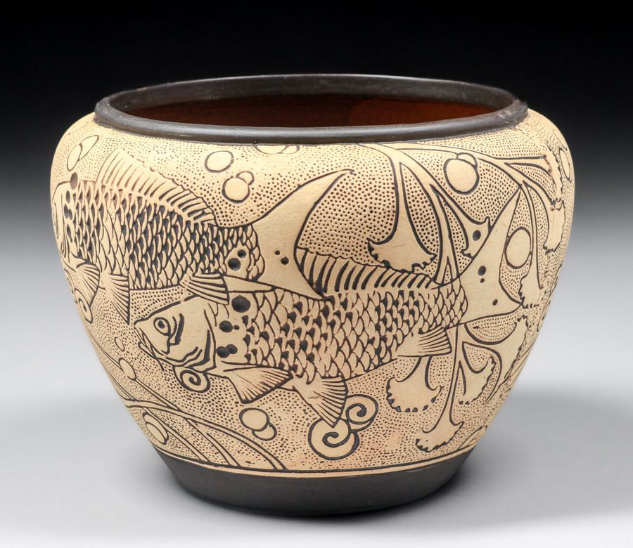 - Large Weller Burntwood Fish Jardiniere c1910s