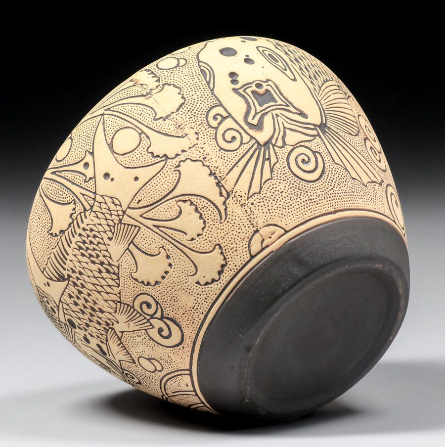 Large Weller Burntwood Fish Jardiniere c1910s. Unsigned. Perfect condition. 9.75"d x 7.5"h SOLD