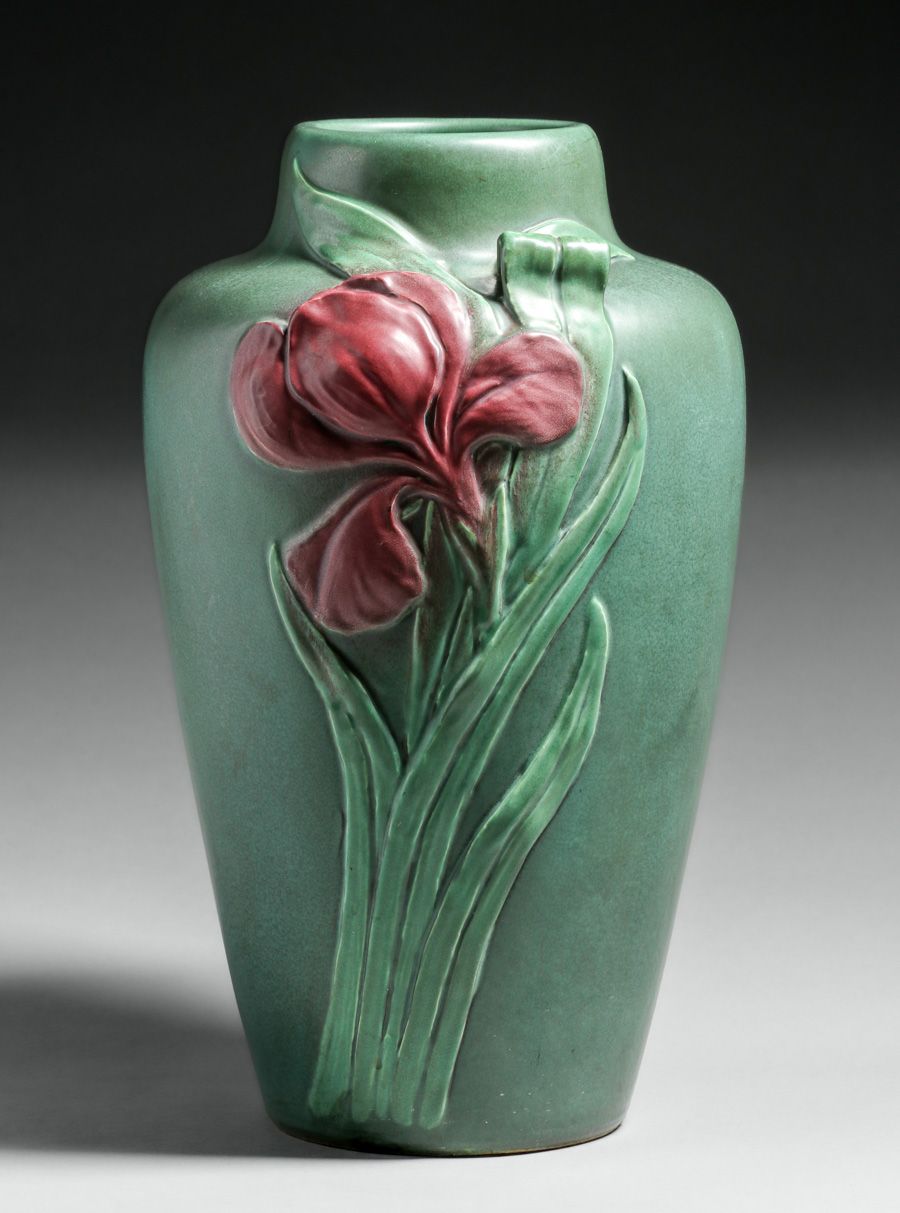 Large Weller Pottery Carved Matte Green & Red Vase c1910. Unsigned. Perfect condition. 16"h x 8.75"d SOLD