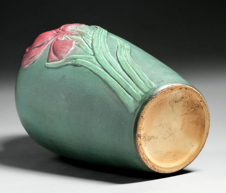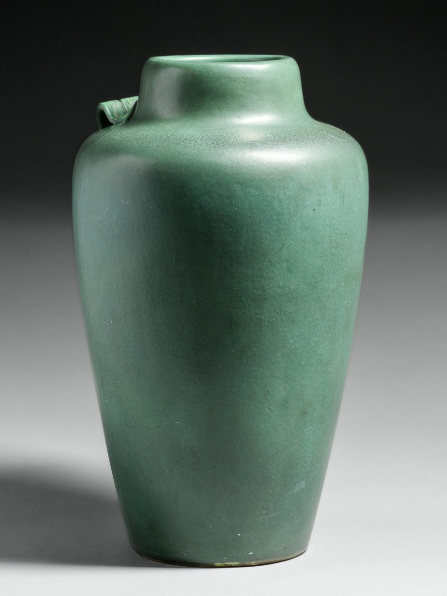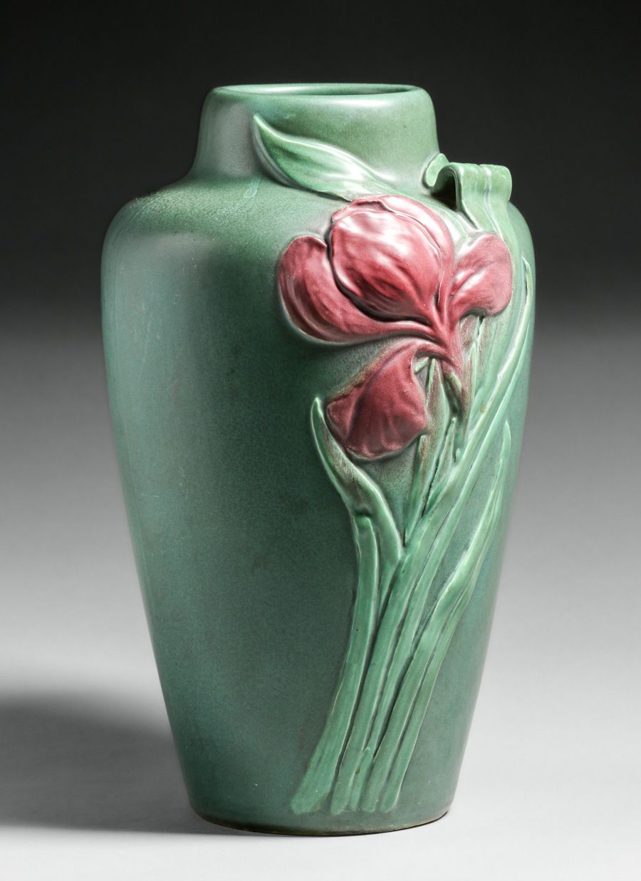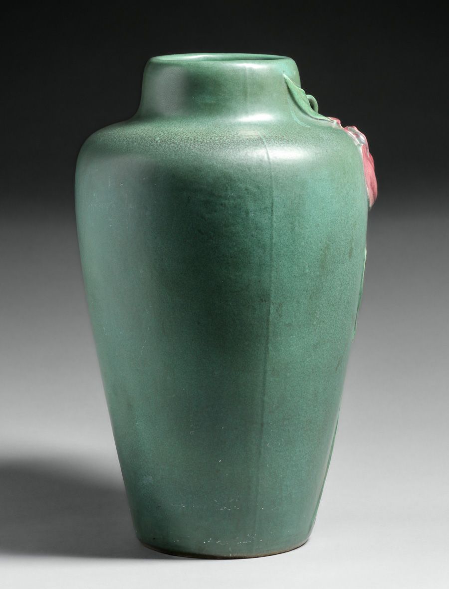 - Large Weller Pottery Carved Matte Green & Red Vase c1910