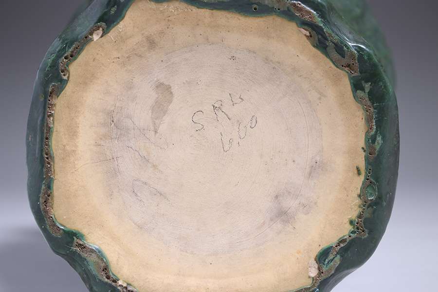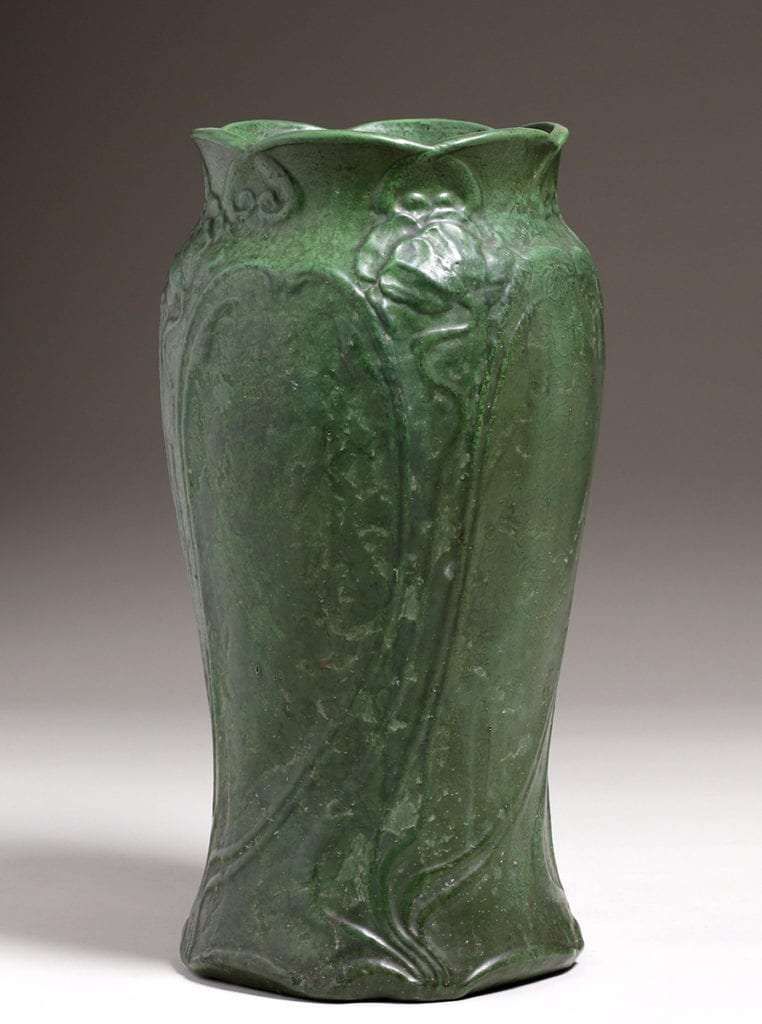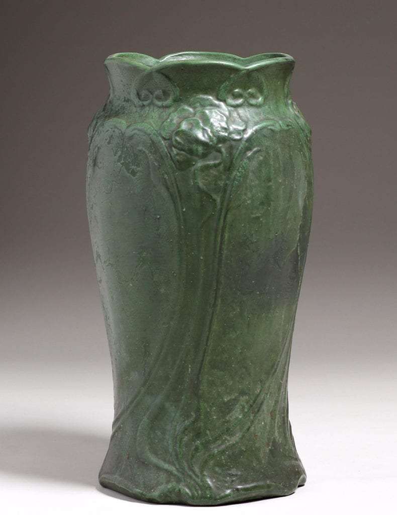 Roseville Chloron matte green Art Nouveau umbrella stand. Unsigned. Perfect condition. 21.5"h x 10.5"d SOLD