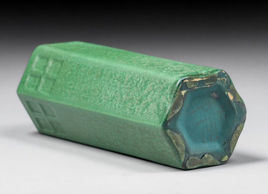 Weller Bedford Matte Green Hexagonal Vase c1910. Unsigned. Invisible professional restoration to tight hairline, otherwise perfect condition. 8.25"h x 3"d SOLD