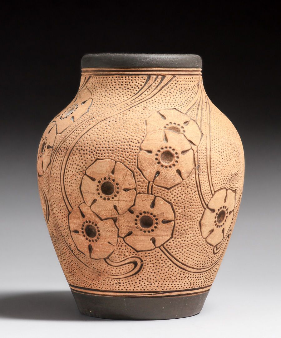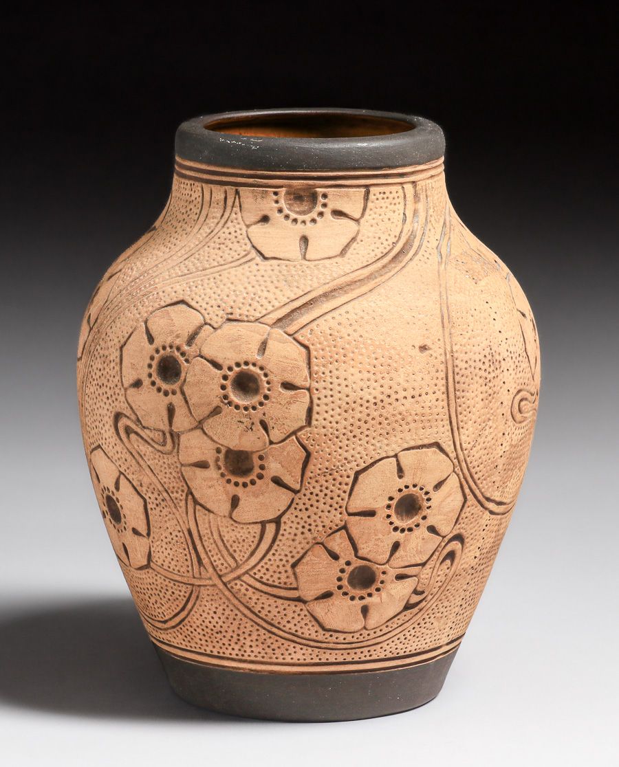 Weller Burntwood Floral Vase c1910s. Unsigned. Perfect condition. 8.25”h x 6.5”d SOLD