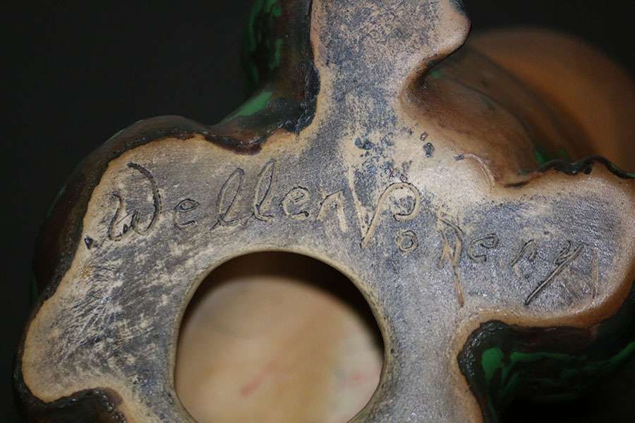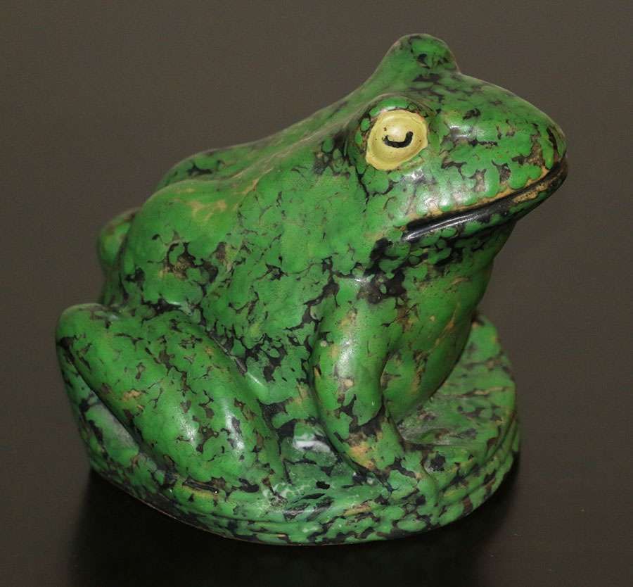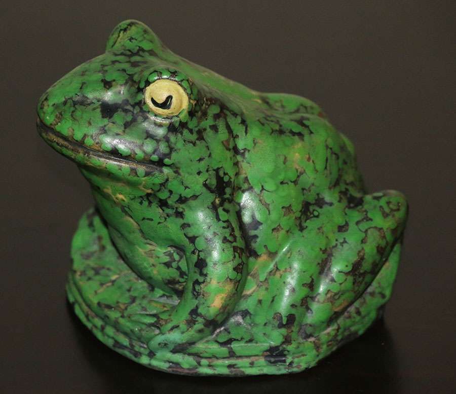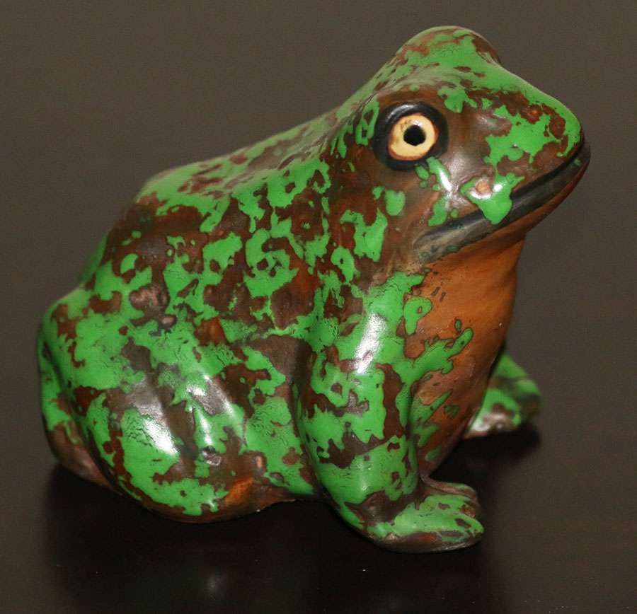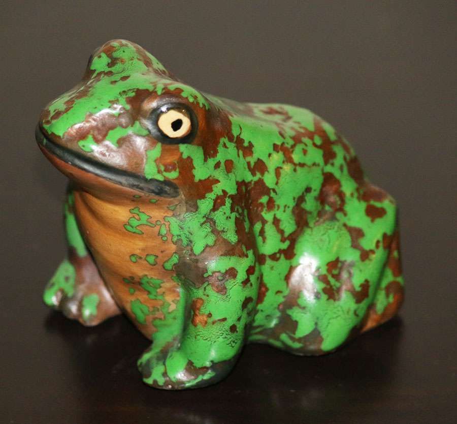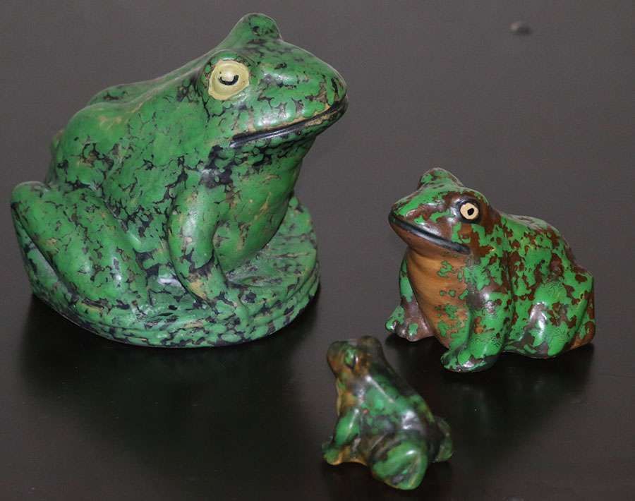 Weller Coppertone Frogs : Largest, tiny edge flake to base, unsigned 5.75"h x 6.75"d x 5.5"w SOLD ; medium, prefect condition, signed, 3.75"h x 4"d x 3"w SOLD ; smallest, perfect condition, unsigned, 2.25"h x 2.5"d x 1.75"w SOLD