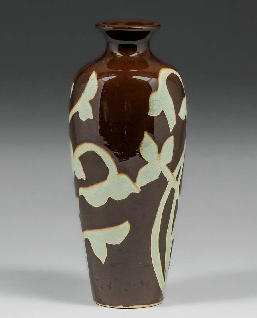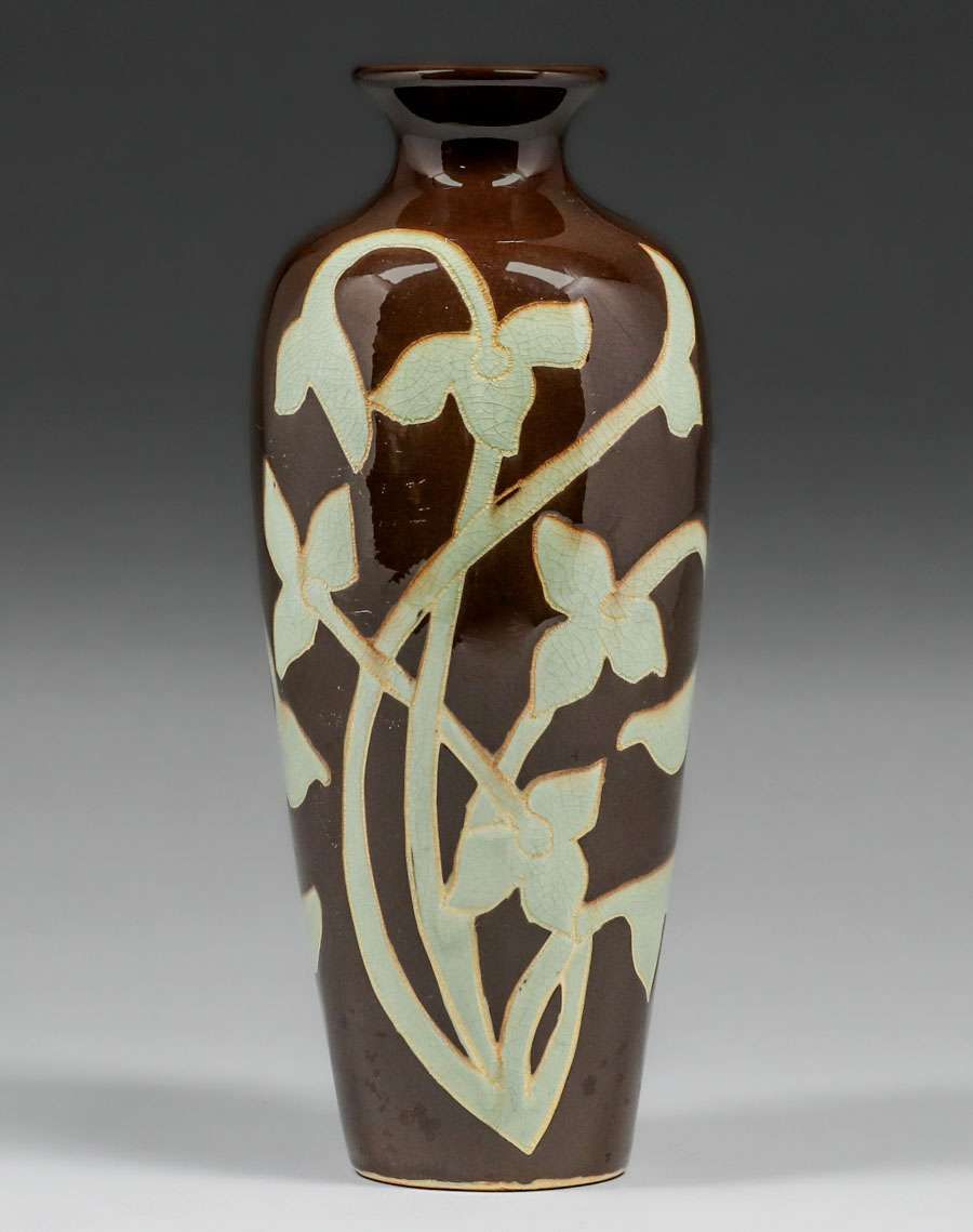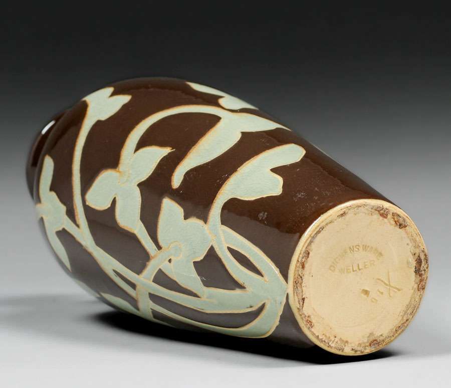 Weller Dickensware Carved Floral Vase c1900s. Signed. Light surface scuffs, otherwise perfect condition. 10"h x 3.75"d SOLD
