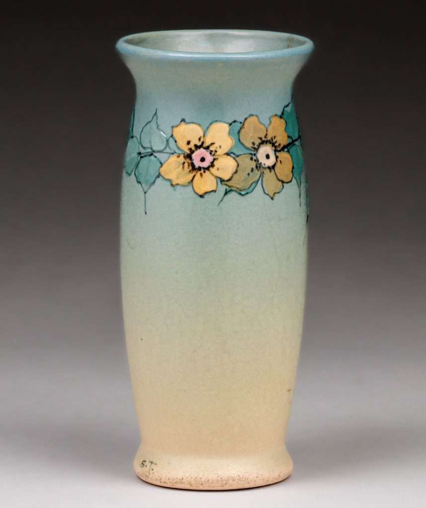 Weller Hudson Sarah Timberlake Floral Vase c1920s. Signed. Some light peppering around base, otherwise perfect condition. 7”h x 3.25”d $450