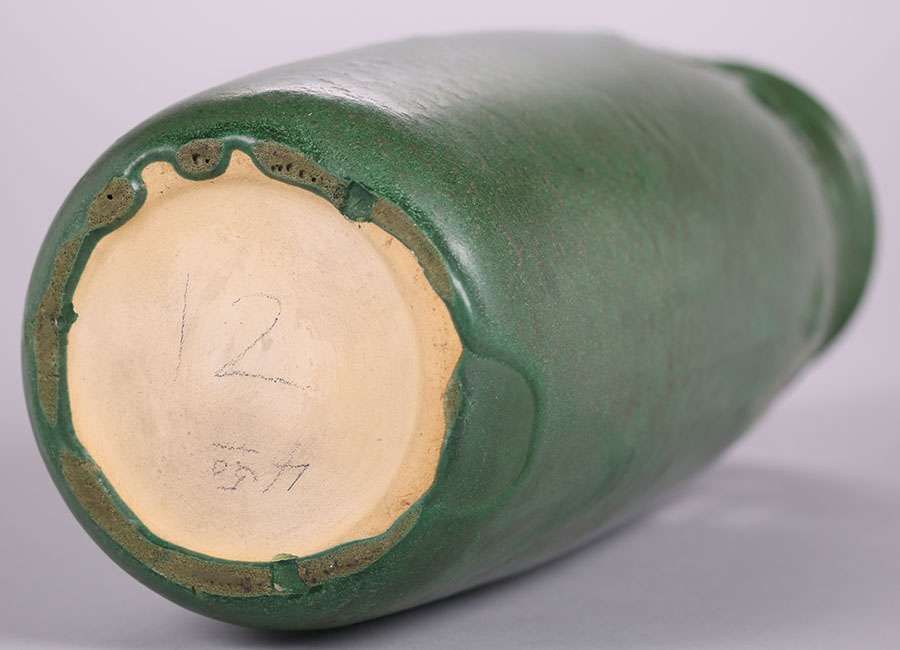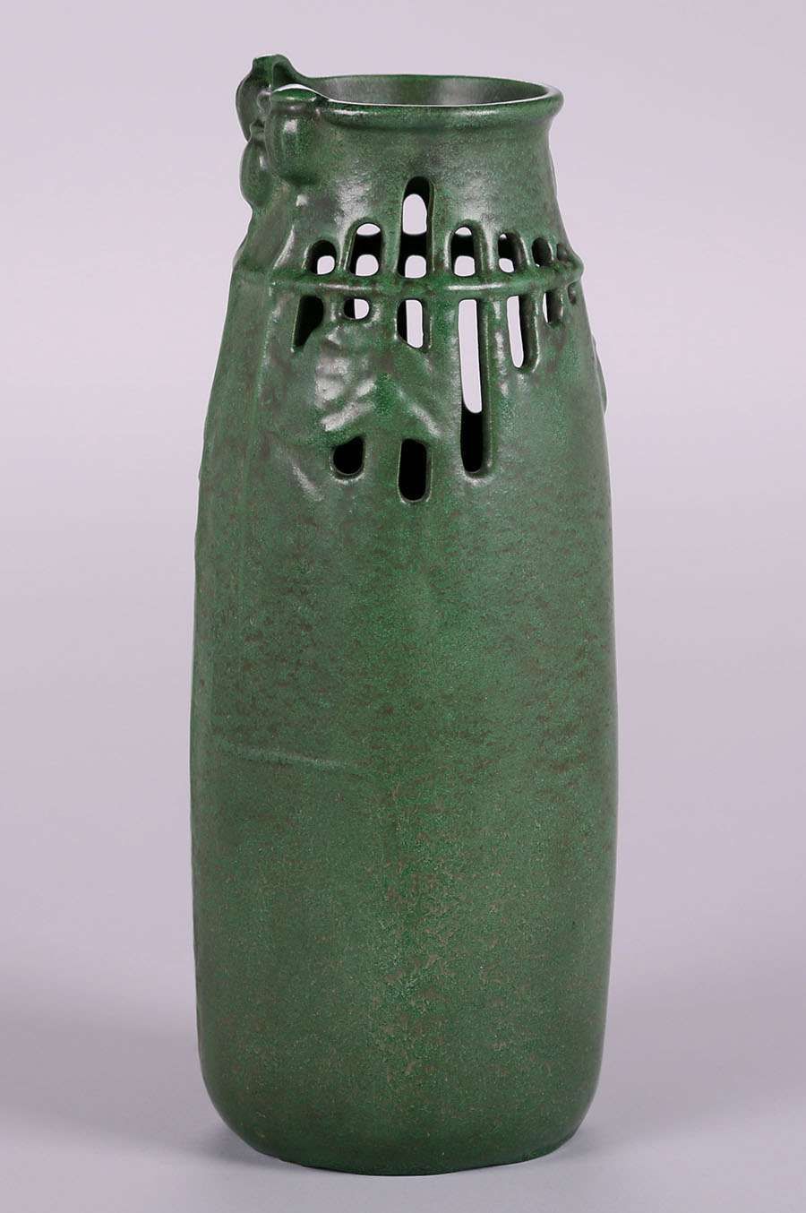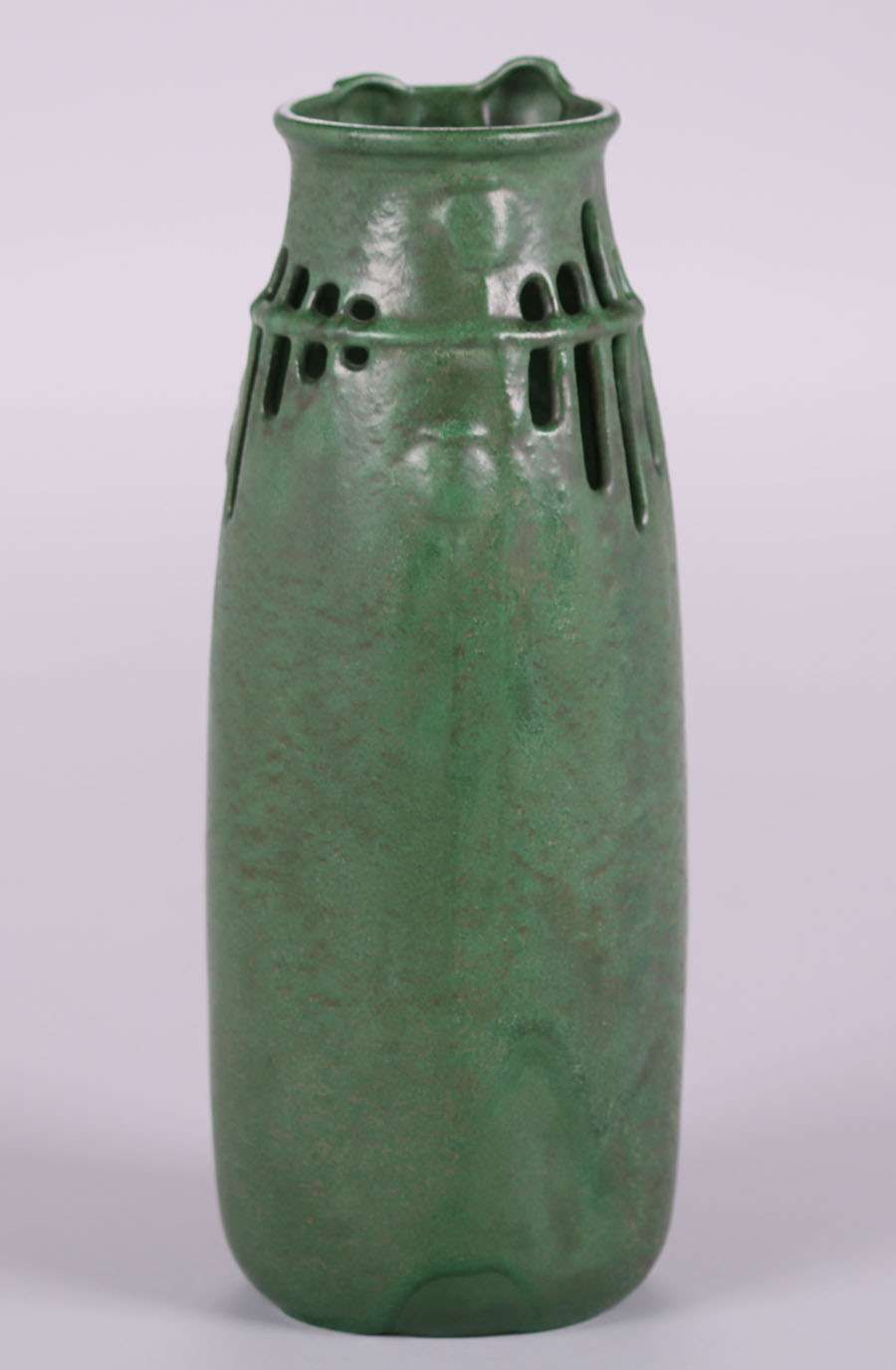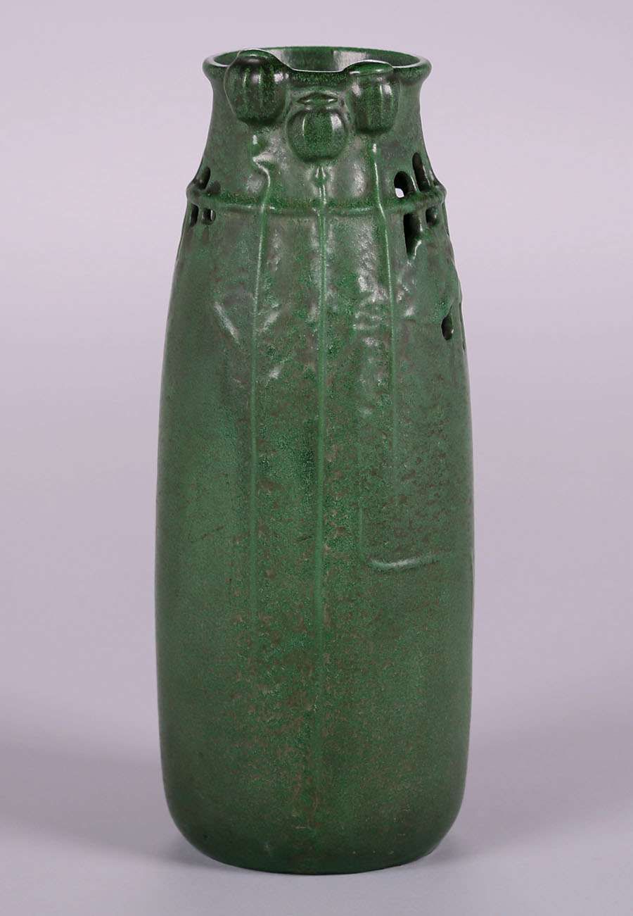 Weller matte green vase with reticulated cutout poppy design. Invisible professional rim repair. 14″h x 5"d SOLD