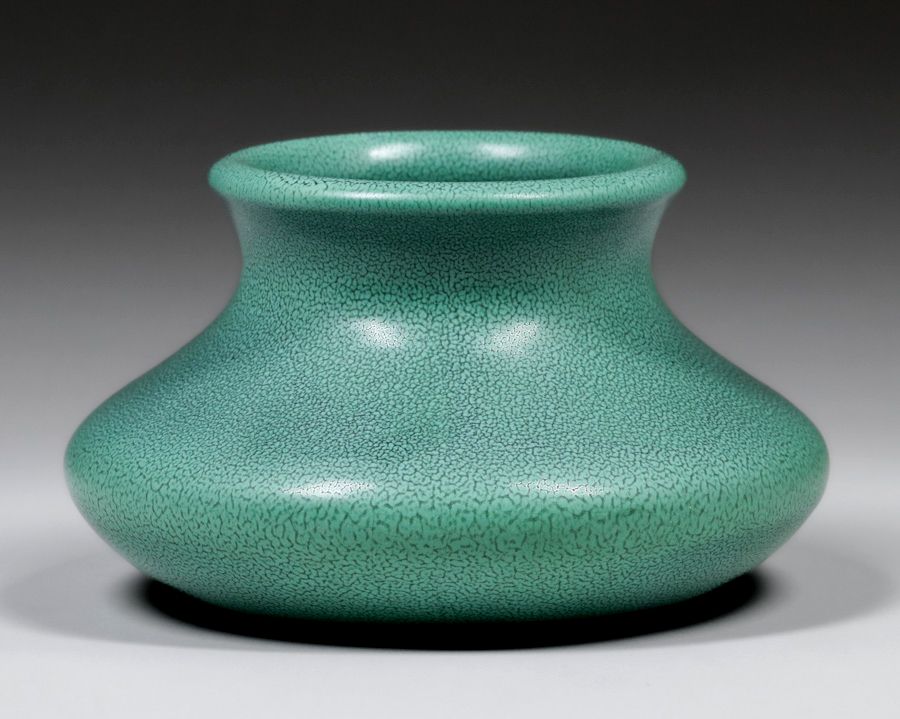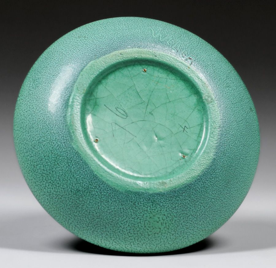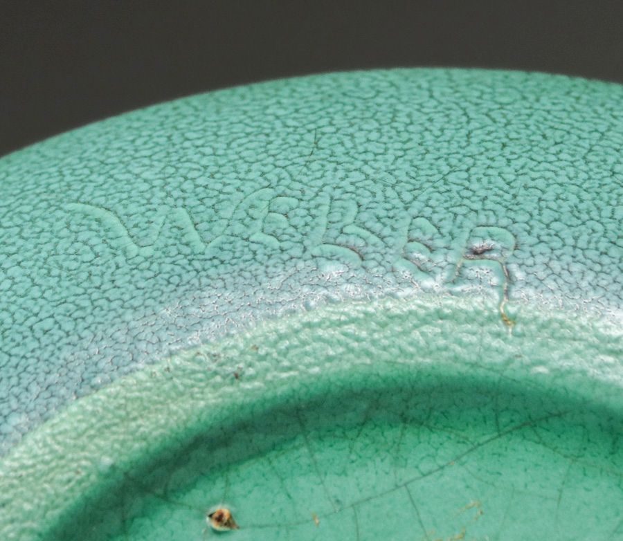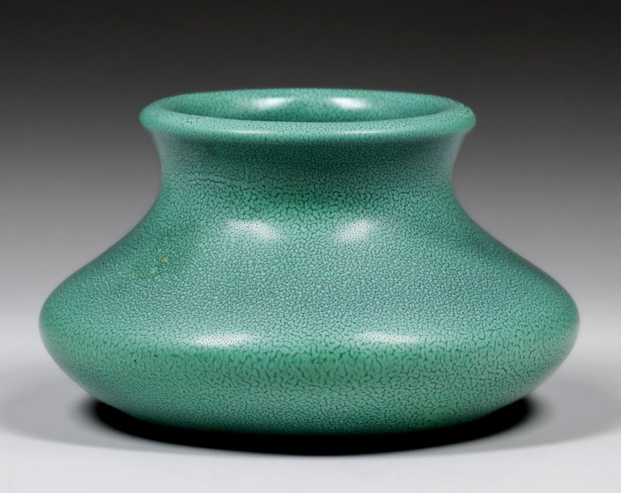 Weller Pottery Fru Russet Matte Green Vase c1910. Signed. Heavy crazing to bottom, otherwise perfect condition. 8d x 4.5h inches SOLD