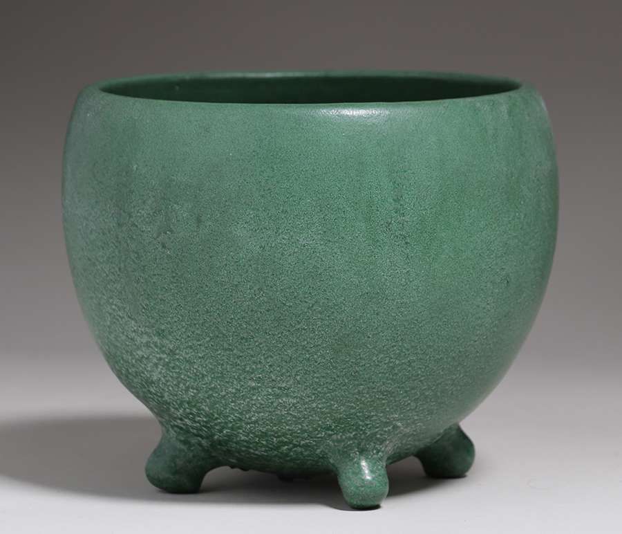 Weller Pottery matte green jardiniere with four feet c1910. Unsigned. Stilt pull irregularities on bottom, otherwise perfect condition. 7.5"h x 9"d SOLD