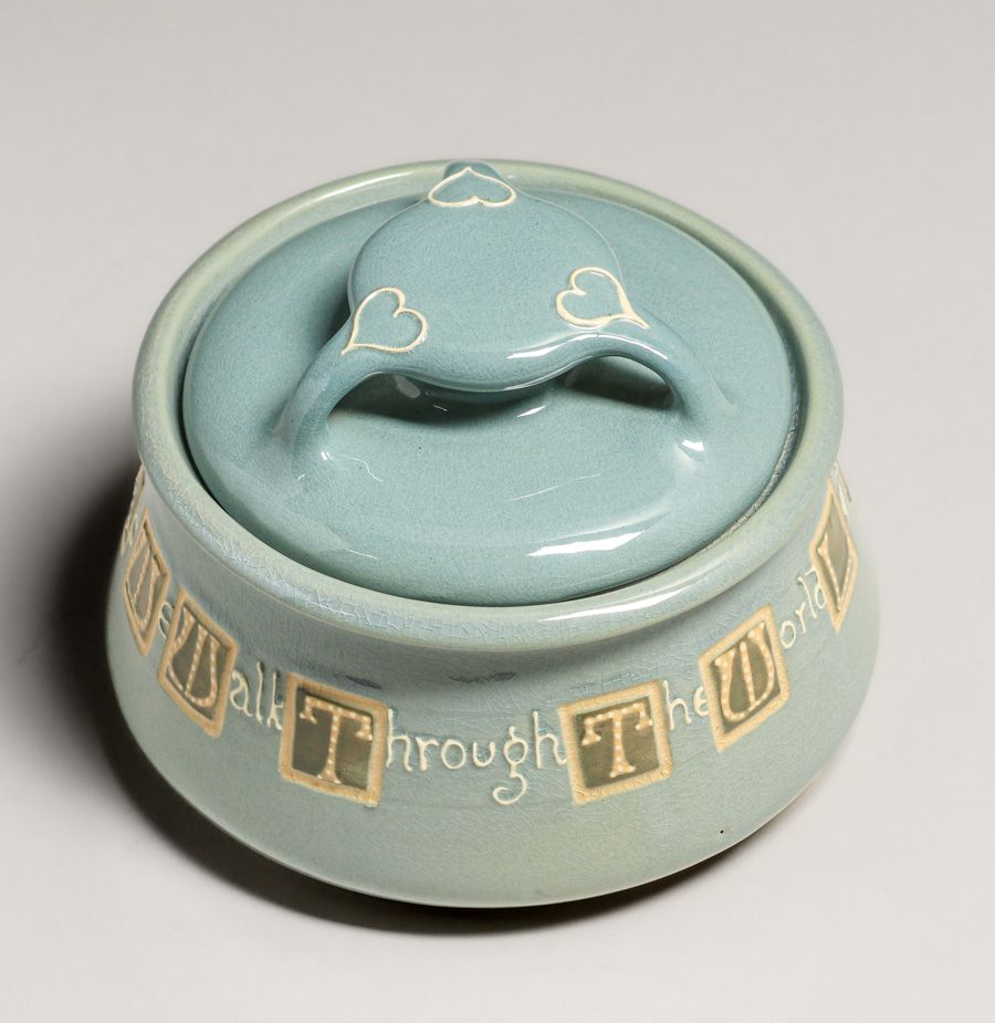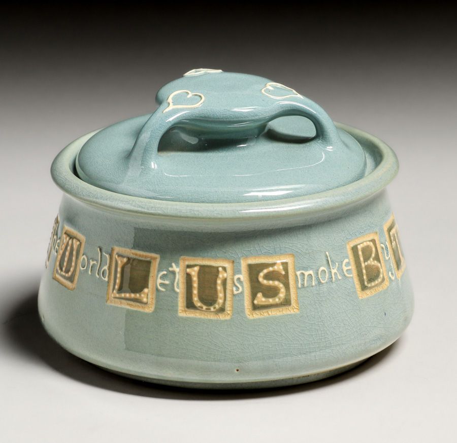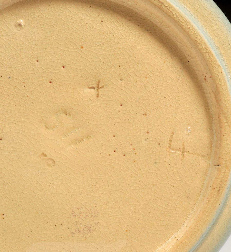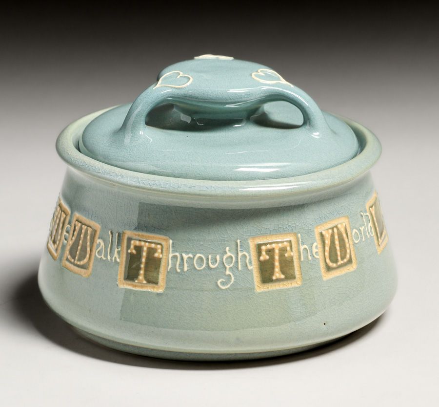 Weller Pottery Rhead Faience Squeeze Bag Decorated Humidor c1904. Unsigned. Perfect condition. 5 7/8"d x 4.25"h SOLD