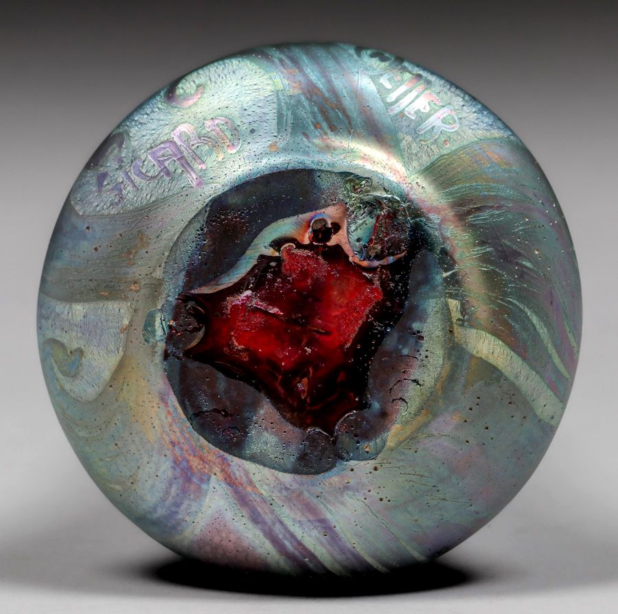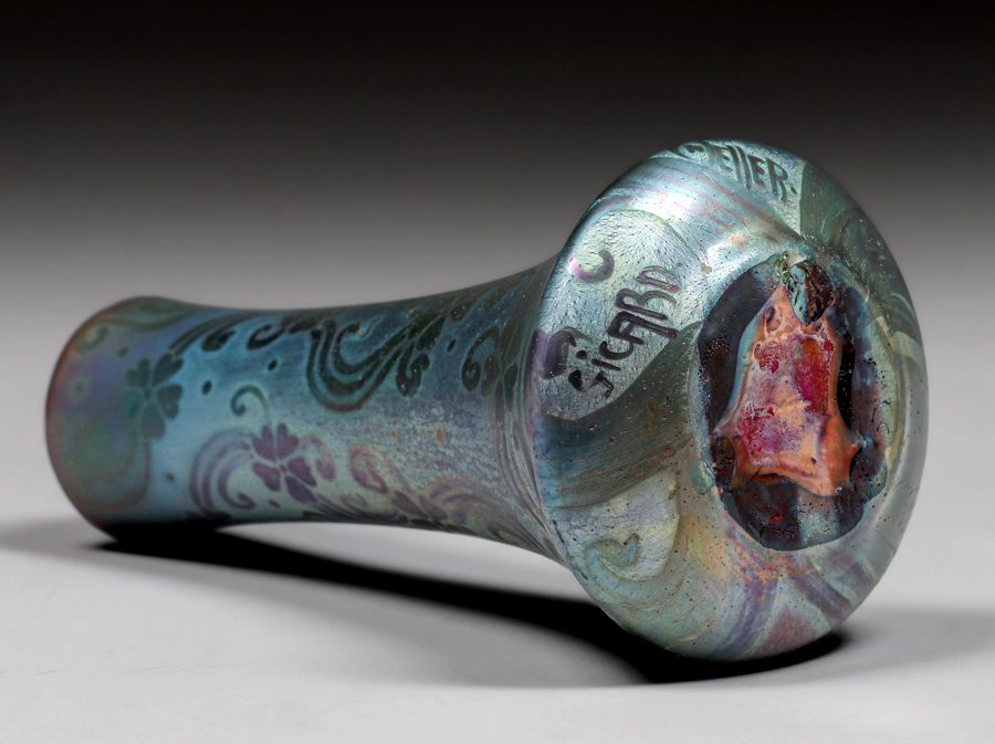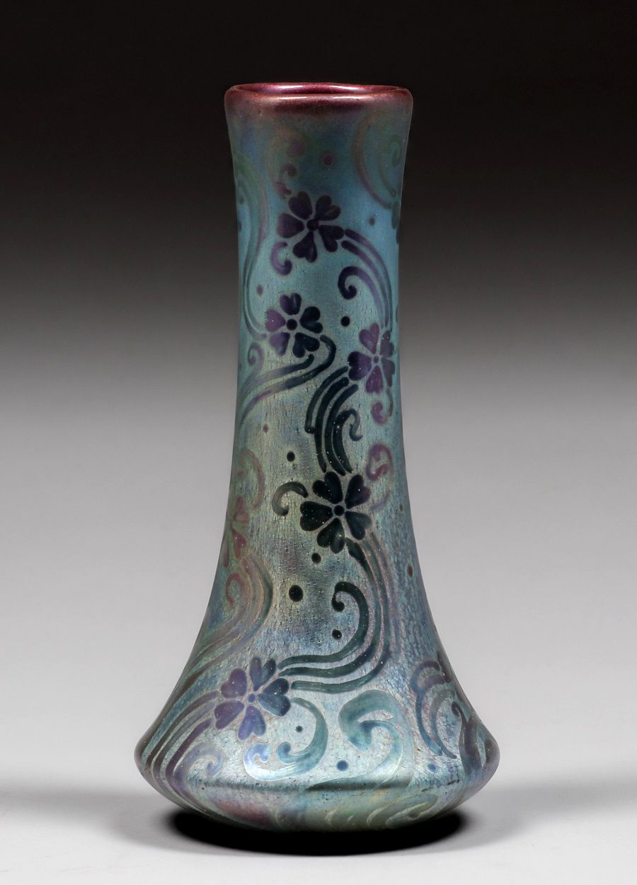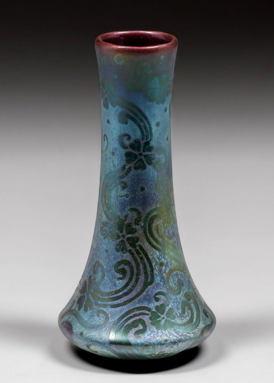 Weller Sicard Corseted Iridescent Vase c1905. Signed. A few glaze bubbles near base, otherwise perfect condition. 7.5"h x 3.75"d SOLD