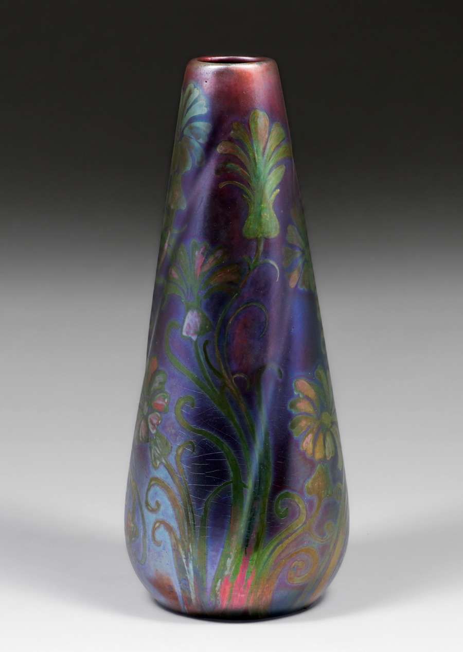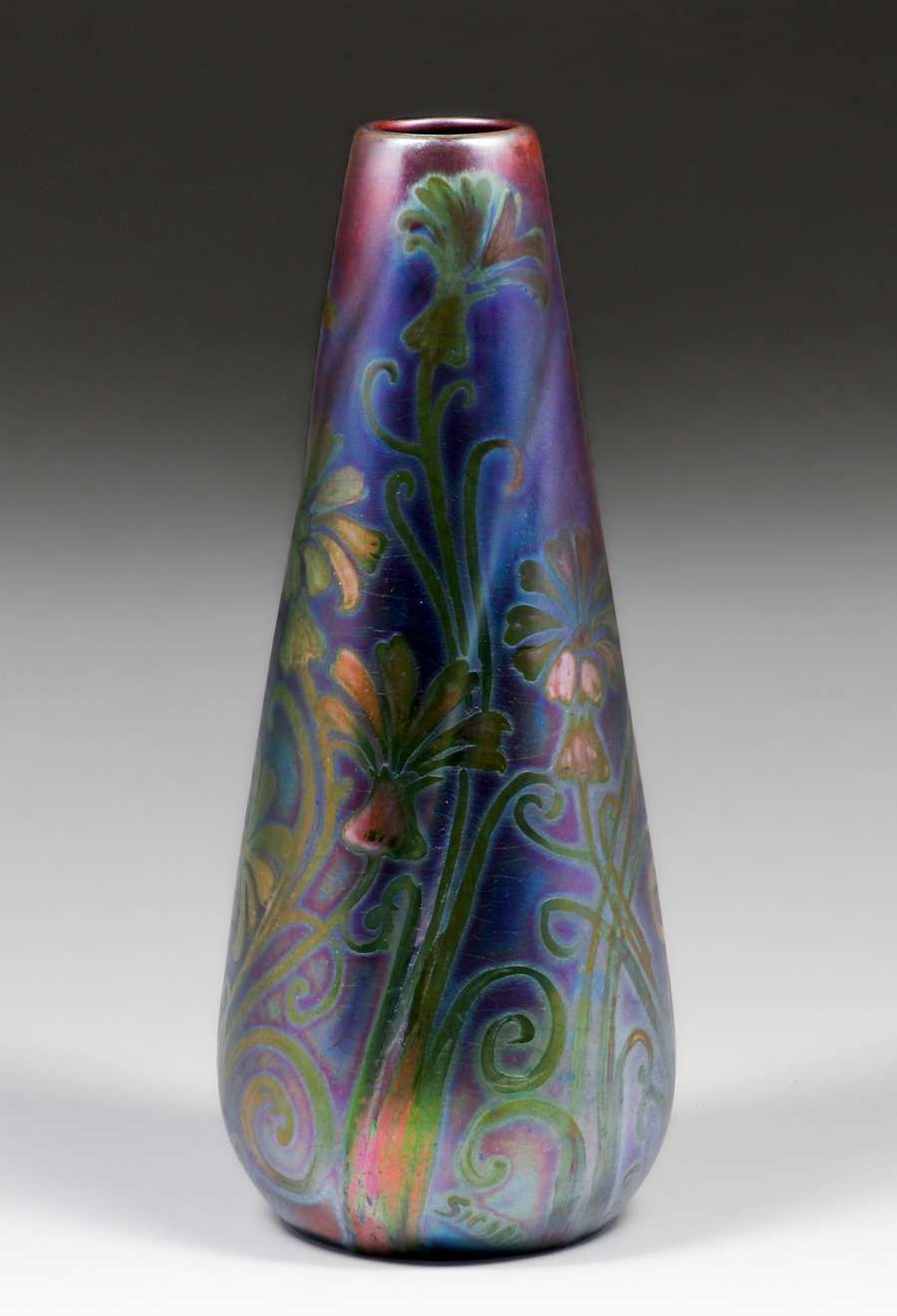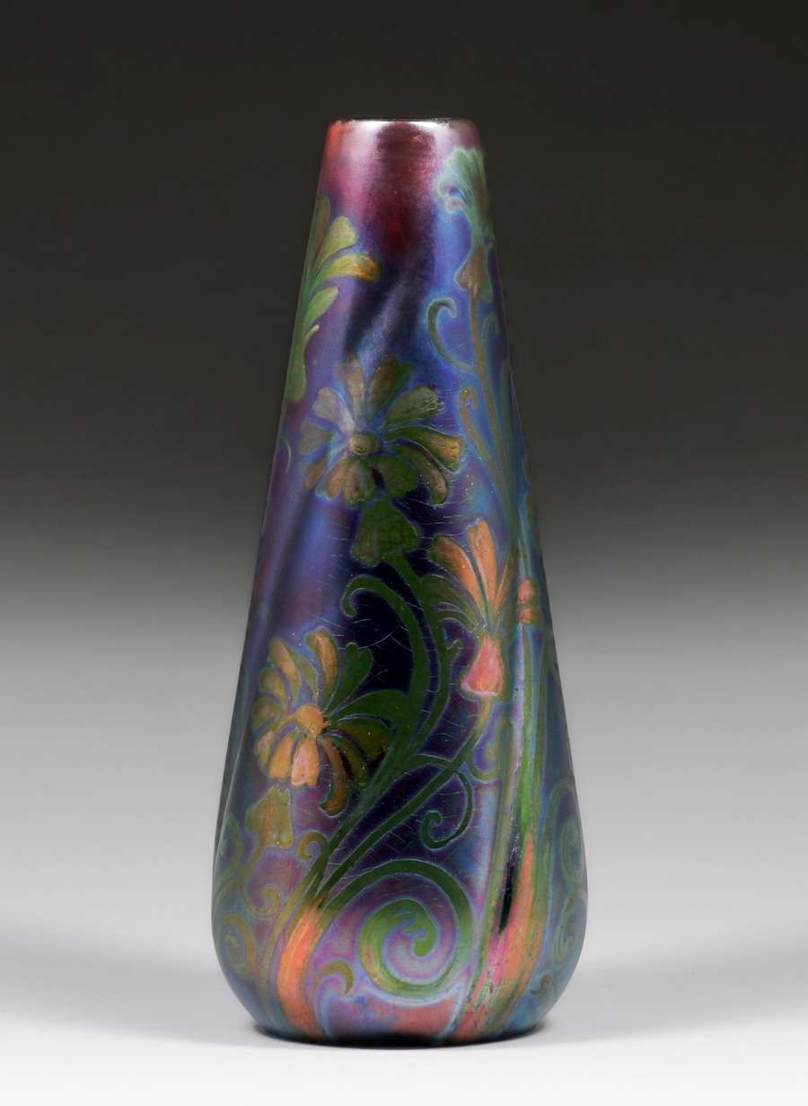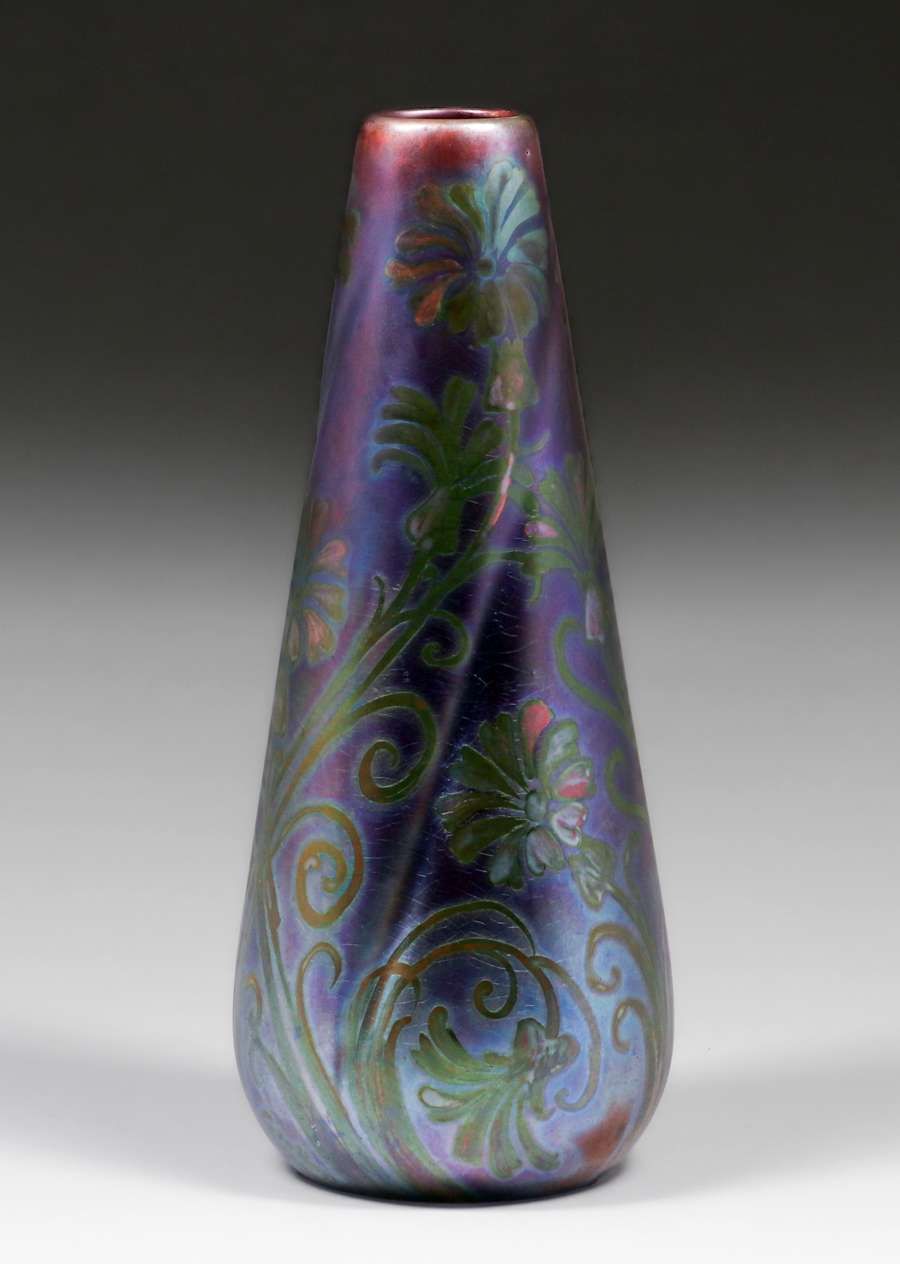 Weller Sicard Iridescent Vase c1905. Signed. Invisible profesional restoration to tight hairline, otherwise perfect condition. 12 1/8"h x 4.5"d SOLD